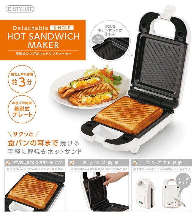 【ブラックフライデー!】 ホットサンドメーカー 《購入特典付》 《取り外して洗える》 脱着式 電気 耳まで 着脱式 厚焼き フッ素樹脂加工 コンパクト お手入れ簡単 ホットサンド おしゃれ KDHS-003W 新生活 引っ越し祝い ☆ クリスマス プレゼント ギフト 防災グッズ 秋冬