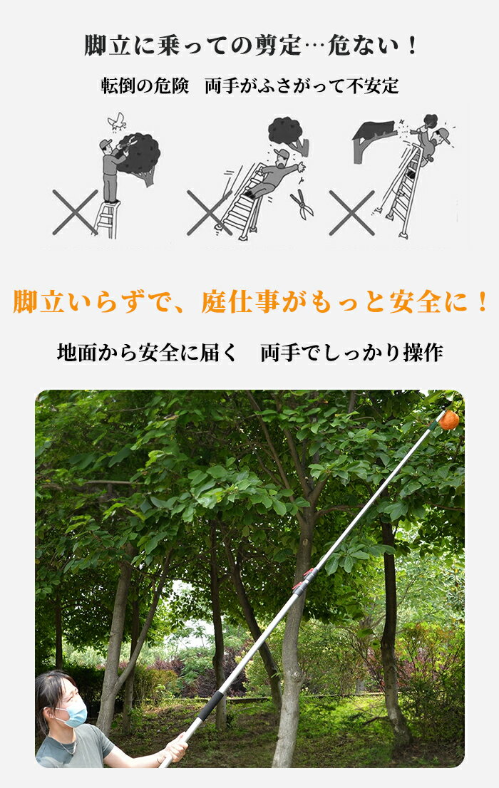 商品 理想的な枝剪定器 【高いところも、低いところも、思いのままに。】 この枝剪定器は、剪定と枝切りの両方をこなす、あなたの庭仕事のパートナーです。3mまで伸びる伸縮ポールで、高い樹冠の枝も、低い所の茂みも、安全かつ快適に剪定できます。脚立を出したり、バランスを崩す心配はもうありません。 【鋭い切れ味と耐久性】 高品質なSK5炭素鋼で作られたブレードは、まるで刃物のように鋭く、直径15mmの枝もスパッと切断。厳しいテストをクリアした耐久性で、長年ご愛用いただけます。低摩擦コーティングにより、樹液が付着しにくく、錆びにくいのも特徴です。 【快適な作業性】 人間工学に基づいたグリップは、長時間作業でも疲れにくく、快適な剪定体験を提供します。 【2段(1.2m~2.2m)】 重量約0.92kgと軽量なため、女性や高齢者でも楽に操作可能です。 【3段(1.4m~3.0m)】 重量約1.37kgで、成人女性におすすめです。 【3段(1.8m~4.0m)】 約1.56kgとやや重くなるため、成人男性に向けます。 【3段(2.1m~5.0m)】 約2.10kgと最も重量があるため、主に成人男性や職業用として推奨です。 【多様な作業に対応】 高い所の剪定はもちろん、低い所のバラや茂みの手入れ、果実の収穫まで、この一台でマルチに活躍。剪定後の果実を落ちないように固定する機能も付いており、あなたの庭を美しく保ちます。 素材 ポール部:軽量アルミパイプ 切刃:SK5高炭素鋼 アンビル(受部)グリップ:プラスチック ハンドル:軽量アルミダイキャスト サイズ 2段 1.2m~2.2m 重量:約0.92kg 3段 1.4m~3.0m 重量:約1.37kg 3段 1.8m~4.0m 重量:約1.56kg 3段 2.1m~5.0m 重量:約2.10kg 原産国 中国 保証期間 商品到着後7日間にお申し出いただいた初期不良のみ交換対応させていただきます。 到着後早々のご確認をお願いいたします。 注意事項 ※商品購入前にお買い物ガイドをご確認下さい。 ※海外輸入品のため、商品の仕様は予告なく変更になる場合がございます。 ※お使いのモニター環境や、撮影場所やイメージにより 実際の商品と色味が若干異なる場合がございます。 ※製品により多少の誤差が生じる場合がございます。 ※工場からの出荷時などで商品にキズや汚れ、ほつれ等がある場合がありますが、 お客様が不良品といわれる場合でも使用上問題のない場合は返品交換などは出来かねます。 キーワード:高枝切りバサミ 太い枝 ノコギリ 剪定鋏 はさみ 高枝切鋏 たかえだきりばさみ強力 高枝切り えだきりばさみ 枝切り鋏 高枝バサミ 枝切ばさみ 高枝のこぎり 高枝切りばさみ 木を切る道具 高枝 女性用 軽い ガーデニング鋏 伸縮式3段で2m~5m調整!SK5高級炭素刃の果物取り・剪定ハサミ・高枝切りノコギリ 一体型 果樹園・庭園用