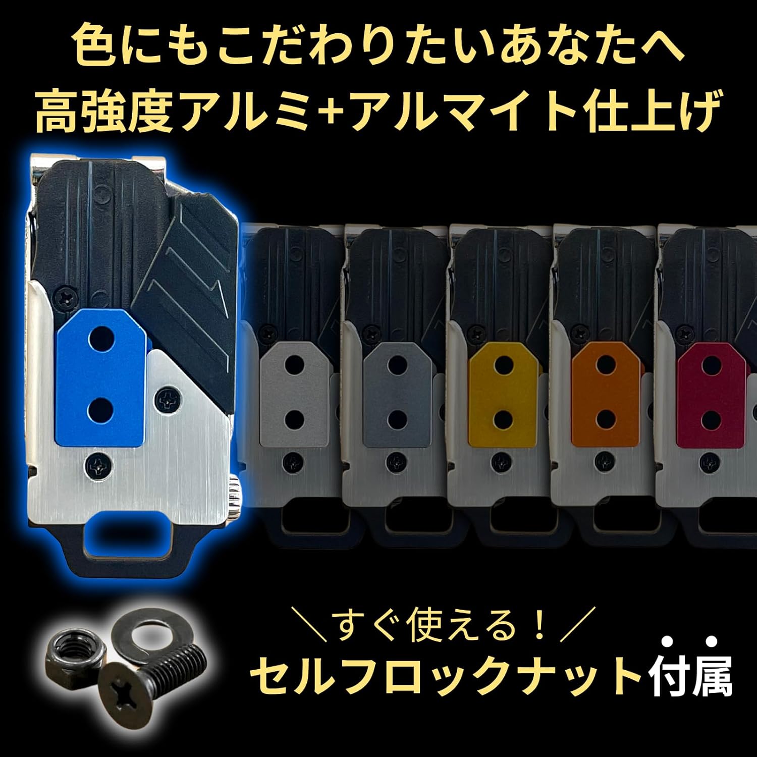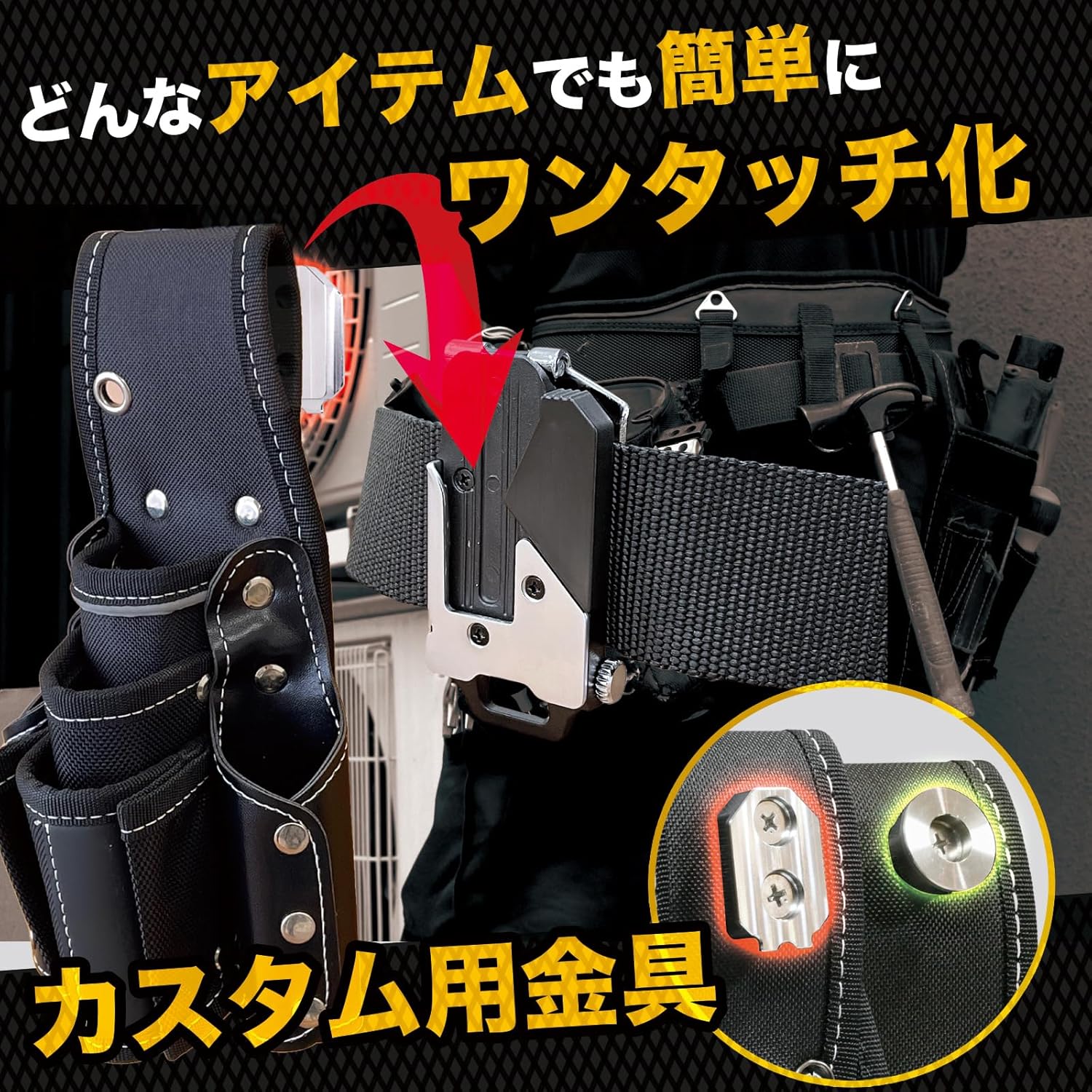 「探す」「付け替える」その手間、ゼロへ。 腰道具、"カチッと"スマート化計画。 現場の「あるある」、こんなお悩みありませんか? 脚立や狭い場所で、道具をスムーズに交換できない… メーカーが違うとホルダーが合わず、腰回りがごちゃごちゃ… しゃがんだ拍子に道具がポロリ…あわや大惨事! 愛用の道具袋や工具があるのに、ワンタッチ化できずに諦めている… 動きやすさを重視する方へ。「回転式(スイングタイプ)」もございます。 SmartBASEが選ばれる3つの理由 【理由1】圧倒的な互換性!主要メーカーに幅広く対応 「タジマ」のメタルセフ・スリムセフや、「コメロン」のコンベックスホルダーなど、市販の様々なワンタッチホルダーに適合!メーカーの垣根を越えて、あなたの腰道具を最適化できます。※適合詳細は下記スペックをご確認ください。 【理由2】プロが認める、軽量&高強度設計 航空機にも使用される高強度なA6061アルミ合金を採用。ハードな現場にも耐えうるタフさを実現。表面には耐食・耐摩耗性に優れた陽極酸化処理(アルマイト)を施し、長く美しい状態を保ちます。 【理由3】届いてすぐ使える!カンタン取り付け 必要なボルト・ナット類はすべて付属。お手持ちの工具や道具袋にネジで取り付けるだけのカンタン設計。ネジ穴がない布製の腰袋などでも、ライターで炙ったクリップ等で簡単に穴を開けて装着可能です。▶ 詳しくは商品説明動画をチェック! 商品仕様 ※カラー、入り数は選択肢よりお選びください。 商品名 SmartBASE ワンタッチ工具ホルダー用オス金具【固定式】 素材 高強度アルミ合金 (A6061, 陽極酸化処理) 付属品 (金具1個につき) ・ステンレスボルト (M5×15mm) ×1・セルフロックナット ×1・ワッシャー ×1 主な適合ホルダー ・タジマ(TAJIMA) セフホルダー (SF-MHLD, SF-MSHLD 等) ・コメロン(Komelon) コンベックスホルダー (QDTMHN 等) ・その他、各社互換ホルダー ご購入前にお読みください 当社は「タジマ」ブランドを展開する株式会社TJMデザイン様とは一切関係がありません。また、当商品ページに記載する他社様の商標、商品画像等は当社製品の互換性を示すためのものであり、各社様と当社の間に提携・承認等の関係があることを示すものではありません。 さあ、あなたも腰道具をスマートにアップデートしませんか? お好きなカラーと個数を選んで、届いたその日からあなたの腰道具をカスタム!毎日の作業を、もっと快適に、もっと効率的に。