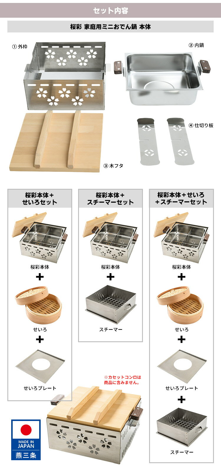 ■商品名:ワクイ 桜彩(さくさい) 家庭用ミニおでん鍋 ■サイズ(約):W305×D240×H150mm(本体のみ/取手・木蓋含む) ■重量(約):1.9kg ■材質・原材料:【外枠・内鍋・仕切り板】ステンレス【木フタ】天然木 ■対応熱源:直火■使用可○:カセットコンロ■使用不可×:IH ■バリエーション:・本体単品(WAKU-WOS-001)・せいろセット(WAKU-WOS-001-OP1S)・スチーマーセット(WAKU-WOS-001-OP2S)・せいろスチーマーセット(WAKU-WOS-001-OP3S) ■メーカー・ブランド:WAKUI(ワクイ) ■生産国:日本(新潟県燕市) ■ご注意: ※2025年11月以前のレビューは、リニューアル前までのレビュー内容となります。予めご了承下さい。 ※カセットコンロは商品に含みません。あらかじめご了承ください。 ※商品の色はモニターの具合で実物と若干異なる場合がございます。予めご了承下さい。 ※デザイン、仕様等につきましては、予告なく変更する場合がございます。予めご了承下さい。 ※ご注文後にメーカーへ在庫確認をさせていただきますため、万が一、メーカー都合により商品がご用意できない場合は、改めてご連絡差し上げます。誠に恐れ入りますがご了承くださいますよう、お願い申し上げます。 ■広告文責:エルスタイル(株) 092-725-1137 ※ メーカー直送商品について ※ こちらはメーカーから直接商品を発送いたします。 ※北海道・沖縄・離島へのお届けはできません。 ※代引き払い、ラッピング、他商品との同梱はできません。 ※基本的にご注文確定後のキャンセルは一切お受付出来ません。万が一、商品発送後にキャンセルとなった場合は、実費送料をご負担頂きますこと、予めご了承下さい。ワクイ 桜彩(さくさい) 家庭用ミニおでん鍋 まるで専門店!おうちで楽しむ本格おでん鍋 まるで専門店!おうちで楽しむ本格おでん鍋 桜のあしらいが映える、美しく端正なフォルム。金属加工の街・燕三条で、確かな技術と丁寧な手仕事から生まれたおでん鍋です。ステンレス製でお手入れ簡単、保温性も抜群。おでんの味わいをしっかり引き出し、最後まであつあつを楽しめます。食卓に並べるだけで、おでん屋さん気分に。ひとりでも、家族でも。おうち時間が、ちょっと楽しくなる本格おでん鍋です。 人気の家庭用おでん・湯どうふ鍋がリニューアル! カセットコンロにぴったりなサイズ感で、お店の雰囲気を演出。本格的な四角い形状は、仕切り板つき。具材をきれいに分けられるのはもちろん、味の混ざりすぎや煮崩れも防げて、最後までおいしく楽しめます。 桜のあしらいが映える、家庭用おでん鍋 ● 専門店気分を演出するデザイン&サイズ感日本の象徴、桜をモチーフとしたデザインと、カセットコンロにピッタリなサイズ感で、お店の雰囲気を演出。いつでもどこでも、これ1つでおでん屋さん気分が楽しめます。● より美味しく美しく取り外し可能な仕切り板付取り外し可能なステンレス製の仕切り板付き。具材がきれいに分けられるのはもちろん、味の混ざりすぎや煮崩れも防げて、最後までおいしく、きれいに楽しめます。● 丈夫で保温性もバツグンなステンレス製ステンレスは錆びにくく、耐久性に優れ、お手入れが簡単。また他の金属に比べ保温性が高く、あつあつのおでんを長く楽しむことができます。● 安心のMadeinJapan 燕三条製品金属加工で知られる新潟・燕三条にあるWAKUIが、企画から製造までをすべて自社で一貫対応。職人の手で一つひとつ、丁寧につくり上げています。 せいろにも、スチーマーにも毎日使える万能鍋 オプションのスチーマー、せいろ&せいろプレートを使えば、蒸し野菜や点心、温め直しなどにも大活躍。四角い形状は調理スペースや食卓でもすっきり収まり、使い勝手も抜群です。季節や献立に合わせて、毎日使いたくなる一台です。 バリエーション ・本体単品(オプションなし)・せいろセット(本体+せいろ+せいろプレート)・スチーマーセット(本体+スチーマー)・せいろスチーマーセット(本体+せいろ+せいろプレート+スチーマー)からお選びください。 角型おでん鍋 関連商品 ワクイ 桜彩 家庭用ミニおでん鍋(直火専用/30×24cm) Dr.HOWS JADAM ヒノキ蒸し器 2段 フルセット(IH対応/26×26cm) ■検索用キーワード:4573564350325/4573564350790/4573564350806/ワクイ/WAKUI/おでん鍋/オデン鍋/おでんナベ/家庭用おでん鍋/おでん調理器/おでん調理機/おでんメーカー/湯豆腐鍋/湯どうふ鍋/煮る/煮物/煮込み料理/卓上/テーブル調理/卓上鍋/角型鍋/角鍋/四角鍋/仕切り鍋/セパレート/おでん仕切り/蒸し器/スチーマー/蒸し鍋/せいろ蒸し/せいろ/セイロ/蒸篭/蒸籠/蒸しかご/蒸しカゴ/蒸し籠/蒸す/蒸気/スチーム/スチーム料理/カセットコンロ対応/直火対応/ガス火対応/屋台/お店気分/お家で居酒屋/お家で居酒屋気分/大衆酒場/大衆居酒屋/ステンレス製/ステンレス鍋/燕三条/新潟県燕市/燕三条製/おしゃれ/お洒落/オシャレ/スタイリッシュ/デザイン/シンプル/おすすめ/オススメ/人気/話題/流行り/注目/口コミ/クチコミ/大反響/大好評/大人気/大評判/ホームパーティー/パーテ