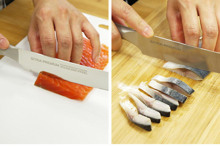 ■商品名:SiTRA プレミアム 刺身包丁 刃渡り24cm ■サイズ(約):【刃長】240mm【全長】375mm【刃厚】2.0mm ■重量(約):120g ■材質:クロムモリブデンバナジウム、ステンレス鋼 ■使用可○:食洗機、磁石式包丁スタンド ■ブランド名:SiTRA(シトラ) ■生産国:日本製 ■管理番号:BHAS-917718 ■ご注意: ※お手入れとして定期的に研ぐことをお勧めさせて頂いております。市販の包丁研ぎ器・シャープナーで十分効果があります。※刃部は焼入れに適したフェライト系ステンレスですので、磁石(マグネット)でくっつけるタイプの包丁立て・包丁ホルダー・包丁スタンドなどで使用可能です。 ※商品の色はモニターの具合で実物と若干異なる場合がございます。予めご了承下さい。 ※デザイン、仕様等につきましては、予告なく変更する場合がございます。予めご了承下さい。 ※複数店舗を運営しておりますため、ご注文の入れ違い等で欠品などになってしまう場合がございます。万が一、発送が遅れる場合は、ご注文受付当日中にご案内差し上げます。誠に恐れ入りますがご了承くださいますよう、お願い申し上げます。 ※ご予約・お取り寄せ商品は、ご注文受付後にお客様ご注文分としてメーカーへ発注を致します為、基本的にキャンセルやご返品はお受けできません。SiTRA プレミアム 刺身包丁 刃渡り24cm モリブデン鋼を使用した切れ味抜群の包丁 モリブデン鋼を使用した切れ味抜群の包丁 鮮度が大切なお刺身も、240mmの長い刃でひと息で切れるので 刺身の断面をなめらかに美味しく仕上げられます。ご家庭の台所でも扱いやすい大きさの全長約375mm。職人が一本一本手研ぎしているので鋭い切れ味。研ぎ直しも簡単です。ハンドルから刃先まで一体型で洗いやすく、雑菌が付きにくいので清潔に保てます。食洗機も使用可。刃部の材質には超硬質ステンレス鋼のモリブデン・バナジウム鋼を採用しており、錆びにくく切れ味が持続します。内部を空洞にしたモナカ構造のハンドルは軽量タイプで扱いやすく、手に沿うドットストライプ柄のハンドルはスッキリとしたデザインかつ滑り止めにもなってます。刃物のまち、岐阜県の関市にて刃付けしているので切れ味抜群です。 SiTRAナイフについて ● お手入れ方法・ご使用後は、汚れを洗い流し、水分を十分に拭きとってください。・長時間使用しない場合は食用油を薄く塗ってください。・サビた包丁で調理をしますと切れ味をそこないます。刃こぼれをおこし、包丁の寿命を縮めることになりますのでおやめください。・市販のシャープナー等で定期的に研ぐことをお勧めします。※パン切り包丁は波型刃のため研ぎ直しできませんのでご了承ください。・食器洗浄機で洗浄できます。● ご使用上の注意・最初に使用する前に、一度、食器用洗剤で洗ってください。・刃先は非常に切れやすくなっています。危険ですので、絶対に直接刃に触れないでください。・刃こぼれの危険がありますので、冷凍食品や骨など硬いものには使用しないでください。・使用後は汚れを取り除き早めに水気を拭き取ってください。・変形や変色などの原因になりますので、火のそばに置かないでください。・錆が発生した場合は、錆を取り除いてから使用してください。・用途以外には使用しないでください。・幼児の手の届かない所に保管してください。 SiTRA包丁一覧 プレミアム 刺身包丁 刃渡り24cm プレミアム 中華包丁 刃渡り17cm プレミアム 小三徳包丁 刃渡り14.5cm プレミアム パン切り包丁 刃渡り22cm プレミアム ペティナイフ 刃渡り13cm プレミアム 牛刀包丁 刃渡り21cm プレミアム 菜切り包丁 刃渡り16cm プレミアム 三徳包丁 刃渡り18cm ■検索用キーワード:4589424742162/刺身包丁/刺身用包丁/さしみ包丁/柳刃包丁/やなぎば包丁/蛸引包丁/三枚おろし/魚さばき用/海鮮/SiTRA PREMIUM/シトラプレミアム/オールステンレスナイフ/ハンドル一体型/モリブデン鋼/錆びにくい/両刃/切れ味/使いやすい/軽量/空洞/包丁/庖丁/料理ナイフ/調理包丁/西洋包丁/洋包丁/肉/魚/野菜/果物/フルーツ/おしゃれ/お洒落/オシャレ/スタイリッシュ/デザイン/シンプル/おすすめ/オススメ/人気/話題/流行り/口コミ/クチコミ/大反響/大好評/大人気/大評判/正規販売店/正規販売品/正規店/正規品/プレゼント/ギフト/贈り物/お祝い/誕生日/バースデー/クリスマス/バレンタインデー/ホワイトデー/新生活/結婚祝い/母の日/父の日 /プチギフト/おもたせ/贈答品/返礼品/お返し/サプライズ/記念日/誕プレ/誕生日プレゼント/クリスマスプレゼント/お中元/お歳暮/暑中見舞い/残暑見舞い/寒中見舞い/余寒見舞い/進級祝い/進学祝い/入学祝い/卒業祝い/成人祝い/成人式/入籍祝い/新築祝い/内祝い/引き出物/引っ越し祝い/引越し祝い/引越祝い/転居祝い/入社祝い/就職祝い/転職祝い/昇進祝い/就任祝い/退職祝い/送別/開店祝い/開業祝い/開院祝い/移転祝い/出店祝い/新店祝い/周年祝い/オープン祝い/大学生/社会人/敬老の日/定年祝い/還暦祝い/友人/友達/友だち/彼女/妻/母親/