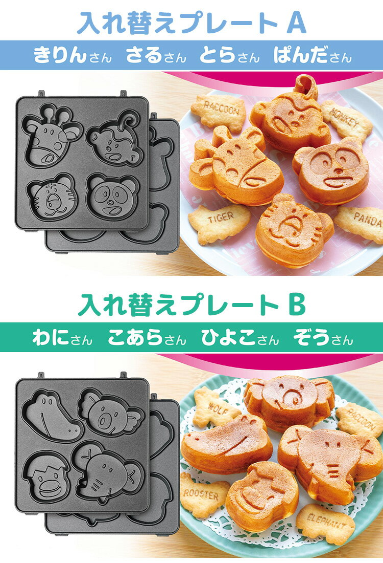 ■商品名:たべっ子どうぶつカステラメーカー 選べるプレート2種付きセット ■サイズ(約):【本体】W150×D240×H110mm/1.2kg【プレート1枚】W140×D150×H15mm/137.5g ■材質・原材料:【本体】フェノール樹脂【プレート】アルミニウム(フッ素樹脂加工) ■セット内容:本体、プレート2種 ■定格電圧:AC100V■定格周波数:50/60Hz■消費電力:650W■温度ヒューズ:240℃■電源コード:約0.9m■交換プレート種類:【プレートA】きりんさん/さるさん/とらさん/ぱんださん【プレートB】わにさん/こあらさん/ひよこさん/ぞうさん ■バリエーション:・プレートAセット(LITH-KDHS-018P-SA)・プレートBセット(LITH-KDHS-018P-SB) ■ブランド名:LITHON(ライソン) ■ご注意: ※商品の色はモニターの具合で実物と若干異なる場合がございます。予めご了承下さい。 ※デザイン、仕様等につきましては、予告なく変更する場合がございます。予めご了承下さい。 ※複数店舗を運営しておりますため、ご注文の入れ違い等で欠品などになってしまう場合がございます。万が一、発送が遅れる場合は、ご注文受付当日中にご案内差し上げます。誠に恐れ入りますがご了承くださいますよう、お願い申し上げます。 ※ご予約・お取り寄せ商品は、ご注文受付後にお客様ご注文分としてメーカーへ発注を致します為、基本的にキャンセルやご返品はお受けできません。たべっ子どうぶつカステラメーカー 選べるプレート2種付きセット たべっ子どうぶつのキャラクターがかわいいカステラに! たべっ子どうぶつのキャラクターがかわいいカステラに! 1度に4キャラクターの顔のカステラが作れるカステラメーカー。材料を入れてふたを閉めるだけの簡単調理。たったの約3分でたべっ子どうぶつのかわいいカステラが焼き上がります。ホットケーキミックスを使用すれば、生地作りも簡単。生地やトッピングをアレンジしたり、お子様と一緒に手作りおやつにチャレンジするのもオススメです。 カステラの作り方 01. 電源を入れて予熱したプレートに生地を流し込みます。02. フタを閉めて約3分待ちます。03. 好みの焼き加減まで焼けたら完成です。<キレイに焼くコツ>※取説に記載の分量で生地を作ることを推奨します。※適量の生地をできるだけ素早く流し入れてフタを閉めると、きれいな形・焼き色に焼き上がりやすくなります。計量カップを使用すると、生地を素早く流し込めます。 アレンジいろいろ 上下半分に切ってクリームやフルーツを挟んだり、パフェのトッピングにすれば、かわいい手作りスイーツのできあがり!いろいろなアレンジが楽しめます。 使いやすさにもこだわりました ● フッ素樹脂加工&着脱式プレートフッ素樹脂加工で焦げ付きにくくなっています。油をひかずに調理できるのでノンオイルでヘルシー。着脱式プレートなので、水洗いできてお手入れ簡単です。● 電源コードすっきり本体の裏面にコードが巻けるので、スッキリ収納できます。● 縦置きコンパクト収納立てて収納できるので、狭いキッチンでも置く場所に困りません。サッと取り出して手軽に使えます。 プレートを交換して更にかわいい仲間たちを増やそう♪ プレートを交換するだけで、かわいいたべっ子どうぶつのカステラを焼くことができます。より焦げ付きにくいWフッ素加工を採用。※Wフッ素加工により、本体のたべっ子どうぶつカステラメーカー(KDHS-018P)に比べて、プレートの色味が濃くなっております。● プレートA … きりんさん/さるさん/ぱんださん/とらさん● プレートB … わにさん/ひよこさん/こあらさん/ぞうさん バリエーション プレートAセット、プレートBセットからお選びください。 たべっ子どうぶつカステラメーカー 関連商品 本体+プレート3種セット 本体+プレート2種セット 本体+プレート1種(単品) 替えプレートA/B(単品) ■検索用キーワード:4573468824144/4573468825356/4573468825363/たべっこどうぶつ/たべっこ動物/ギンビス/アニマル/きりんさん/とらさん/さるさん/ぱんださん/わにさん/ひよこさん/こあらさん/ぞうさん/らいおんくん/かばさん/うさぎさん/ねこさん/カステラベーカー/フッ素加工/コーティング/こびりつきにくい/焦げ付きにくい/プレート着脱/プレート交換/ベビーカステラ/ミニケーキ/パンケーキ/ホットケーキ/お菓子作り/スイーツ/おかし/お菓子/軽食/朝食/おやつ/サンドイッチ/そのまま/挟むだけ/子供が喜ぶ/ロングセラー/おしゃれ/お洒落/オシャレ/スタイリッシュ/デザイン/シンプル/かわいい/おすすめ/オススメ/人気/話題/流行り/注目/口コミ/クチコミ/大反響/大好評/大人気/大評判/インスタ映え/写真映え/SNS映え/インスタグラム/Instagram/映え料理/ホームパーティー/パーティー/誕生日会/クリスマス会/子供会/子ども会/クリスマスパーティー/お家カフェ/家カフェ/おうちカフェ/おうち時間/正規販売店/正規販売品/正規店/正規品/プレゼント/ギフト/贈り物/お祝い/誕生日/バースデー/クリスマス/バレンタインデー/ホワイトデー/新生活/結婚祝い/母の日/父の日 /プチギフト/おもた