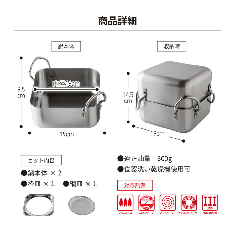 ■商品名:取っ手も場所を取らない 油ターン(ユウターン) スクエア 16cm ■サイズ(約):【鍋】(内寸)幅160×奥行160×深さ70mm(外寸)幅190×奥行190×高さ95mm、板厚:0.7mm【網皿】直径150×高さ15mm【枠皿】幅170×奥行170×高さ10mm【収納時】幅190×奥行190×高さ145mm ■容量(約):【適正油量】600g / 鍋(1個)【満水容量】1.7L / 鍋(1個) ■重量(約):【鍋(1個)】380g【網皿】30g【枠皿】50g【総重量】840g ■材質・原材料:ステンレス鋼 ■セット内容:鍋×2個、網皿×1個、枠皿×1個 ■自社管理品番:ANT-A-78063 ■パッケージサイズ(約):幅20×奥行21×高さ15 cm ■メーカー・ブランド:アーネスト ■生産国:日本 ■ご注意: ※商品の色はモニターの具合で実物と若干異なる場合がございます。予めご了承下さい。 ※デザイン、仕様等につきましては、予告なく変更する場合がございます。予めご了承下さい。 ※複数店舗を運営しておりますため、ご注文の入れ違い等で欠品などになってしまう場合がございます。万が一、発送が遅れる場合は、ご注文受付当日中にご案内差し上げます。誠に恐れ入りますがご了承くださいますよう、お願い申し上げます。 ※ご予約・お取り寄せ商品は、ご注文受付後にお客様ご注文分としてメーカーへ発注を致します為、基本的にキャンセルやご返品はお受けできません。 ■広告文責:エルスタイル(株) 092-725-1137取っ手も場所を取らない 油ターン(ユウターン) スクエア 16cm 揚げ物をした後はオイルポットにもなる、2人〜4人用に丁度良い揚げ鍋セット 揚げ物をした後はオイルポットにもなる、2人〜4人用に丁度良い揚げ鍋セット 2人〜4人に丁度良いスクエア型の揚げ鍋セットです。調理後、使った油をもう一方の鍋に注ぎ入れて、蓋として使っていた鍋を被せることで、オイルポットとしても使えます。次回使用するときは、オイルポット側を揚げ鍋として使用できます。網皿、枠皿、本体2個を重ねる事で油を保管しながらスッキリと収納できる上にハンドルも上向きなので場所も取りません。スクエア型なので、デッドスペースが無くスッキリと収納できます。揚げ物油切り用と、ろ過用の兼用網皿付です。より綺麗にろ過したい時はキッチンペーパーを敷いてろ過するのがおすすめです!スクエアで角があるので油をこす際に注ぎやすい形状です。金属製品の産地として有名な新潟県燕三条で職人がまごころ込めてつくった丈夫なステンレス製で、食洗機にも対応しています。 片付け楽ちんで揚げ物のハードルを低くする! 調理後は『オイルポット』になる『揚げ鍋』でもっと気楽な揚げ物生活♪食卓でも大人気の揚げ物ですが、作るのも片付けるのもとっても面倒ですよね。この揚げ鍋「取っ手も場所を取らない 油ターン(ユウターン) スクエア」ならそんなお悩みを解決!使った揚げ鍋は、使用後は『オイルポット』に!こちらは同じ揚げ鍋が2つセットになっているダブルフライヤータイプです。片方を揚げ鍋として使い、調理後はもう片方に油をこしてオイルポットとして使用できます。普通なら揚げ鍋とオイルポット、2つ必要ですがこちらの揚げ鍋なら1つに機能がギュッと凝縮。付属の網皿で油をこして、残った揚げカスを捨てるだけなので片付けもグッと楽になりますよ。 秘密はスクエア型。油は節約しつつ揚げれる量は多く! 揚げ鍋は16cmサイズとやや小ぶり。必要な油の量も「600g」と揚げ鍋にしては経済的です。そんな小型サイズの揚げ鍋の困ったポイントは一度に揚げられる量が少ないこと…。しかしこの揚げ鍋はスクエア型!角までスペースがあるので一度に沢山揚げることができるんです。エビフライなら4〜5本、トンカツなら2枚ほど一度に揚げられるのでキッチンに立つ時間も短くできます。2〜4人家族の方にオススメなサイズ感です! 上向きハンドルで調理中も収納時も場所を取らない 揚げ物中にハンドルに手がぶつかってヒヤッとしたことはありませんか?こちらの揚げ鍋はハンドルが上向きに取り付けられているので、作業中も邪魔にならず、収納時もハンドルがかさばらずスッキリ収納できます。本体も小型なので、コンロの横や引き出しの中など収納場所を選ばないのもオススメポイントです。 金物のまち、新潟県燕三条エリアで丁寧に製造 こちらの揚げ鍋は丈夫で耐食性に優れたステンレス製です。末永くご使用いただけるよう、金物の産地である新潟県燕三条エリアで製造しております。 油ターン サイズ違い一覧 取っ手も場所を取らない 油ターン 16cm取っ手も場所を取らない 油ターン 20cm取っ手も場所を取らない 油ターン 14cm ■検索用キーワード:油ターン/ユウターン/油ターン/スクエア/ARNEST/Arnest/あーねすと/A78063/セット/新潟県/燕三条/揚げ物鍋/油こし器/油処理/揚げ物/保存/節約/コンパクト/収納/天ぷら/串揚げ/フライ/唐揚げ/四角い鍋/場所を取らない/取っ手上向き/上向きハンドル/小さい鍋/ミニ/揚げ鍋/網付き/枠付き/ダブルフライヤー/重ねる/蓋付き/油はねガード/IH/ガス/火対応/食洗機対応/新生活/一人暮らし/2