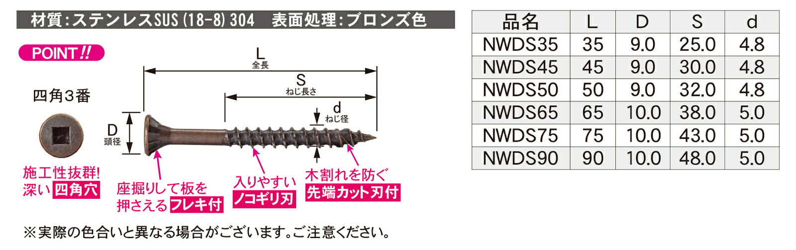 商品情報仕様●品名:ウッドデッキ材用ビス 12号箱x6●専用ビット1本付●材質:ステンレスSUS(18-8)304●表面処理:ブロンズ色●NWDSサイズ:35・45・50・65・75・90●12号箱寸法:W120xD120xH90【6箱入】DANDORI VIS ダンドリビス ウッドデッキ材用ビス NWDS(ステンレス) 12号箱 1ケース(6)特価!【代引き不可】【沖縄・離島配送不可】 堅木以外は下穴不要材質:ステンレスSUS(18-8)304表面処理:ブロンズ色 2