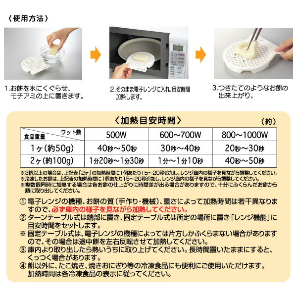 電子レンジでアッという間にふっくらおもち!しかも、おもちがくっつかない!くっつかない秘密は「ダブルエンボス加工」!かわいいおもち形のモチアミです。お餅以外に、たこ焼き、焼きおにぎり等の冷凍食品にも便利にご使用いただけます。 ※ポスト投函でのお届けになります。 ※代金引換や他の商品との同梱の場合は、後ほど通常送料に訂正させて頂きます。 ※ポスト投函のため、日時指定には対応しておりません。 ■表面:ダブルエンボス加工■調理法:レンジ加熱のみ(※オーブン、グリル、トースターは×)■調理時間目安:約40秒(角もち1個、500Wの場合)■耐熱温度:120℃■耐冷温度:−20℃■サイズ:147×130×20mm■重量:45g■カラー:ホワイト[材質]ポリプロピレン(耐熱温度120℃/耐冷温度−20℃)[付属品]−