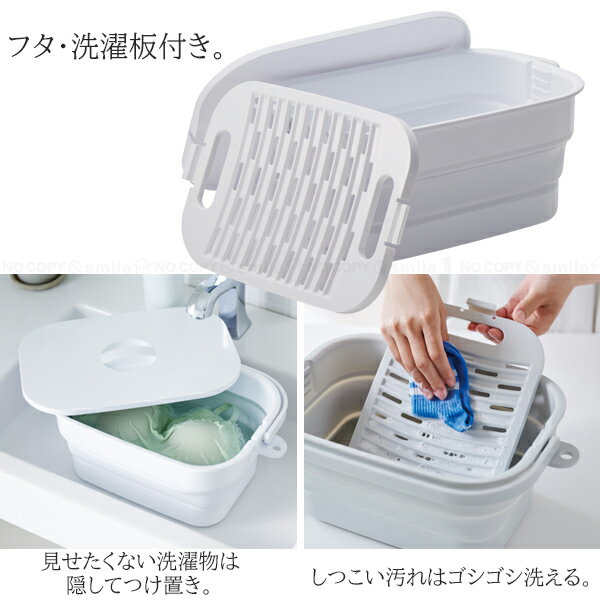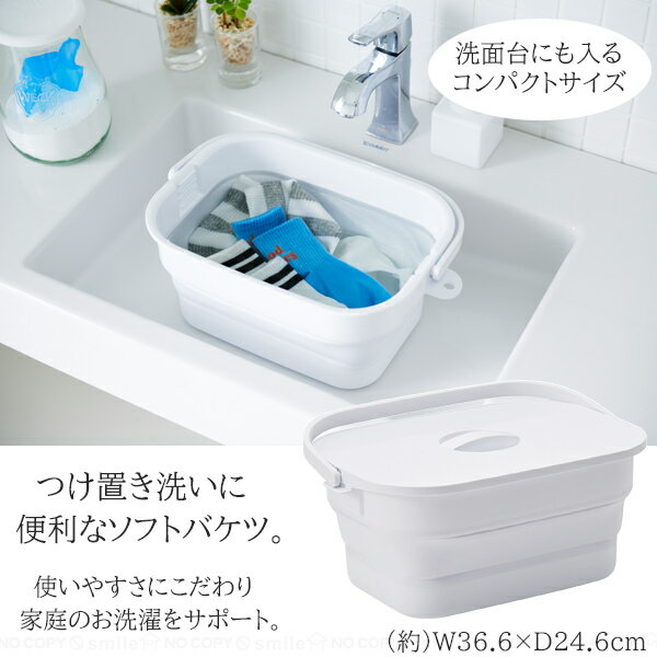 ソフト素材で折りたたみができるつけ置き洗いバケツ7L。 使いやすさにこだわった、洗濯や掃除に便利な多機能バケツです。 洗面台にも入るコンパクトなサイズ。 洗濯板が付属しており、しつこい汚れもしっかり洗えます。 また、洗濯板は落とし蓋としても使用可能で、浮いてきてしまう上履きや洗濯物も沈めてつけ置きできます。 フタも付属しているので、見せたくない洗濯物も隠してつけ置きが可能。 折りたためるから、収納スペースを節約でき、フック穴付きで吊り下げ収納もできます。 さらにハンドルも付いているから、お掃除バケツにしたりとマルチに活躍できます。 サイズ 使用時:(約)幅36.6×奥行24.6×高さ16cm 収納時:(約)幅36.6×奥行24.6×高さ6.7cm 耐熱耐冷温度 (約)-20~100度 素材・材質 本体:熱可塑性エラストマー 枠・底・ハンドル・フタ・洗濯板:ポリプロピレン 生産国 日本製 キーワード バケツ つけ置き 洗い 上履き シューズ 洗濯物 長方形 コンパクト 7L すき間 折り畳める ソフトバケツ 収納 フック穴付 ボックス 洗い桶 手洗い 洗濯 洗面所 掃除 シンプル ホワイト グレー 202510-05