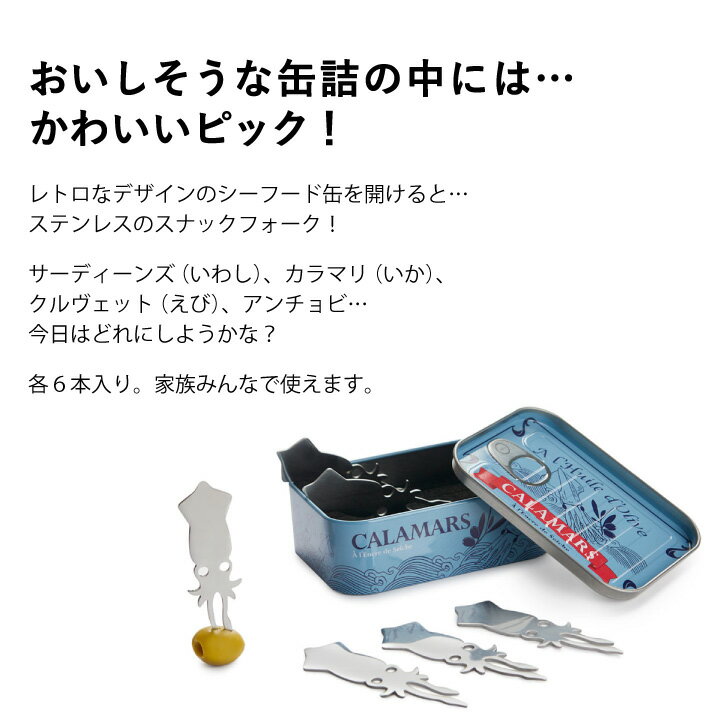▼ 関連商品 ▼ ・balvi(バルビ) アイテム一覧 ブランド balvi(バルビ) 商品詳細 レトロなデザインのシーフード缶を開けると、 中にはステンレスのスナックフォーク。 6本入りで家族みんなで使えます。 本物そっくりな缶詰入りでギフトにもおすすめです。 サイズ 缶:(約)幅10.5×奥行7.8×高さ3.5cm 素材・材質 ステンレス鋼 備考 ※パソコンの種類や環境、画面の解像度や明度によって、実際のお色や柄と若干異なる場合がございます。予めご了承くださいませ。 キーワード スナック フォーク ミニ ピック ステンレス 楊枝 つまようじ おつまみ 魚 シーフード 缶詰 サーディーン カラマリ クルヴェット アンチョビ そっくり ユニーク ユーモア キッチン グッズ テーブル カトラリー ギフト SNACK FORK バルビ balvi 202510-05
