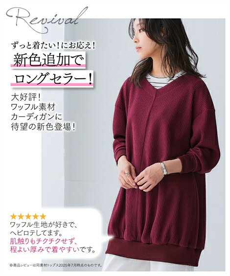 ワッフル素材ロング丈ドルマントップス(UVカット)<大きいサイズ有> 黒 杢チャコールグレー ミルクベージュ サックス コーラルピンク ブラウン セージグリーン カラー黒 杢チャコールグレー ミルクベージュ サックス コーラルピンク ブラウン セージグリーン サイズS~M相当 L~LL相当 3L~4L相当 5L~6L相当 8L相当 10L相当 素材 品質・[本体]ポリエステル65%・綿35% [リブ部分]ポリエステル97%・ポリウレタン3% ドルマンスリーブのためゆったりとしたシルエットとなっております。透け感・やや透ける ※色によって透け感が異なる場合があります。淡色カラーはベージュ系インナー着用をおすすめします。伸縮性・あり生地の厚み・普通光沢感・なしポケット・なし季節・春・秋シルエット・ゆったり洗濯機OK ネット使用 原産国 中国製 メーカー品番 ZZY4J25A0167 コメント ロングセラー!ざっくり編み目が旬なワッフル素材のプルオーバー。Vネックのゆったりドルマンシルエットと絶妙な丈感で気になるヒップや腰回りをばっちりカバーします。■デザインゆったりドルマンシルエットで楽々。Vネックで顔周りをスッキリ見せてくれます。お尻周りが隠れる絶妙な丈感で体型カバーを叶えます。■素材ざっくりと大きめの編み目が可愛いワッフル素材。生地表面に凹凸があるので毛羽立ちやシワが目立ちにくく、キレイをキープしてくれます。軽い生地感で着心地が良く、肩が凝らないというお声をいただいています。■おすすめのスタイリングいつものスリムパンツはもちろん、丈が長すぎないので分量感のあるロングスカートやワイドパンツとも相性良し。寒い時は中にタートルを合わせてもかわいく長く使え着回しのきく1枚です。