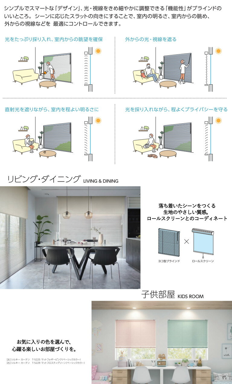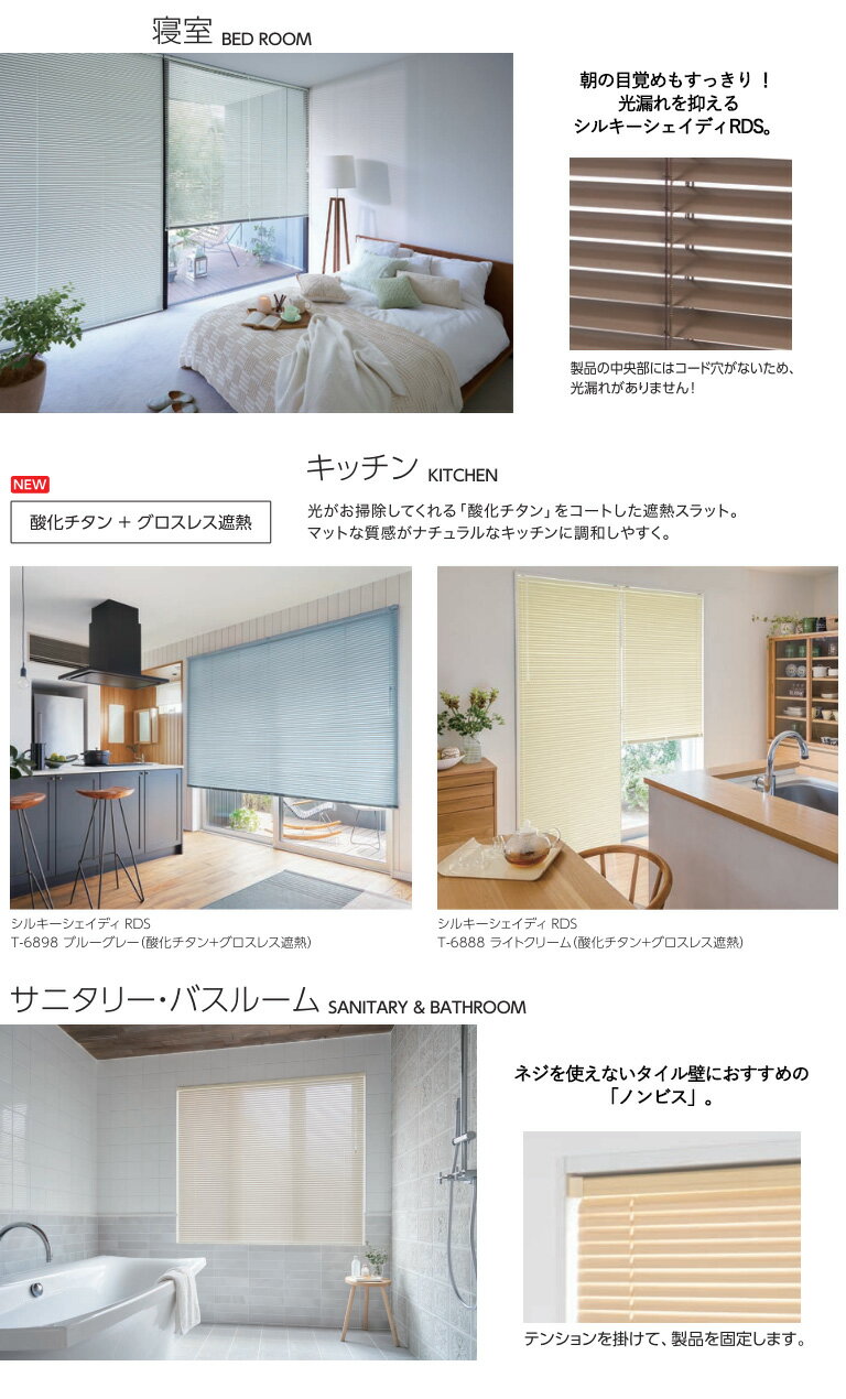 商品詳細 【インテリア商材・E-スタート発送商品】 ●商品番号が違うもの、他メーカー商品、当店出荷商品は同梱できません。 コンビニ受取り不可商品です。 ご注文時の買い物かごの価格表示及び、楽天からの自動配信メールの価格は〔最小サイズ〕の価格となり、ご注文の価格《9番での見積もりの赤い字の価格》とは異なる場合がございます。 《見積もりの赤い字の価格》がご注文の価格となります。 当店にて受注後、オーダーいただいたサイズの価格《見積もりの赤い字の価格》に修正させて頂きます。 自動見積もりシステムをご利用の際は、買い物かごの個数を変更せずにご注文手続きへお進みください。 ●代金引換・時間指定ができません。 画面上の色と商品の色は異なる場合がございます。 サンプルにてご確認ください。 注文集中により欠品する場合がございます。 在庫欠品の際はご容赦願います。 ◆返品・交換 不可◆ 品番、カラー、サイズや仕様などをよくご確認の上、ご注文をお願い致します。 商品に関しまして、不明な点などございましたらご購入前にお問い合わせください。 検索用キーワード 浴室 お風呂 サビにくい 水まわり アルミブラインド ヨコ型ブラインド 横型ブラインド コンパクト ブラインドカーテン 窓まわり 窓回り 窓周り DIY 和室 洋室 キッチン ダイニング 子供部屋 リフォーム 小窓 遮光 オーダーサイズ オーダーメイド 清潔 タチカワ 立川 25mm ポール デザイン ウッド パール マット ツヤ消し つや消し 自動見積 オート サンプル オーダーサイズ 見積もり 楽天 E-start E-スタート フッ素 + 遮熱 T-4522 シャインピュアホワイト T-4576 ナチュラルアイボリー T-4233 ライトオークル T-4546 ムーンイエロー T-4232 セピアローズ T-4574 サンドグレー T-4566 ニュアンスブラウン T-4234 コーラル T-4570 パウダーグリーン T-4129 スカイグリーン T-4577 ブロンズブラック T-4536 カフェブラウン T-4231 ガトーブラウン T-4311 スカイグレー T-4238 セレストブルー 防汚 キッチン ペット 簡単に汚れが落ちる 省エネ 日射熱を反射 熱エネルギー軽減掲載カタログ (その他の商品もお取り扱いしております。掲載されていない商品でもご注文可能です。) - タチカワブラインド シルキー - 「窓辺にこころ通わせる タチカワブラインドのプロダクト」 採光や通気といった機能面で住まいを快適にするとともに、インテリアの要として日々を彩り、心と暮らしが豊かにするという大切な働きも担っています。 インテリアとしての“窓”を仕上げるプロダクトを通じて、一人ひとりの心に響く、新しい窓辺の演出をご提案します。 ※RDSありとなしをお選びいただけます。 ※お使いの環境(モニター、ブラウザ等)の違いにより、色の見え方が実物と若干異なる場合がございます。 サンプルにてご確認いただけますようお願いいたします。 ※こちらの商品ページに記載しております商品情報はカタログの一部です。 詳しい商品情報(機能詳細・施工・メンテナンス・部品カラー・注意事項など)は メーカーの デジタルカタログ でご確認ください。