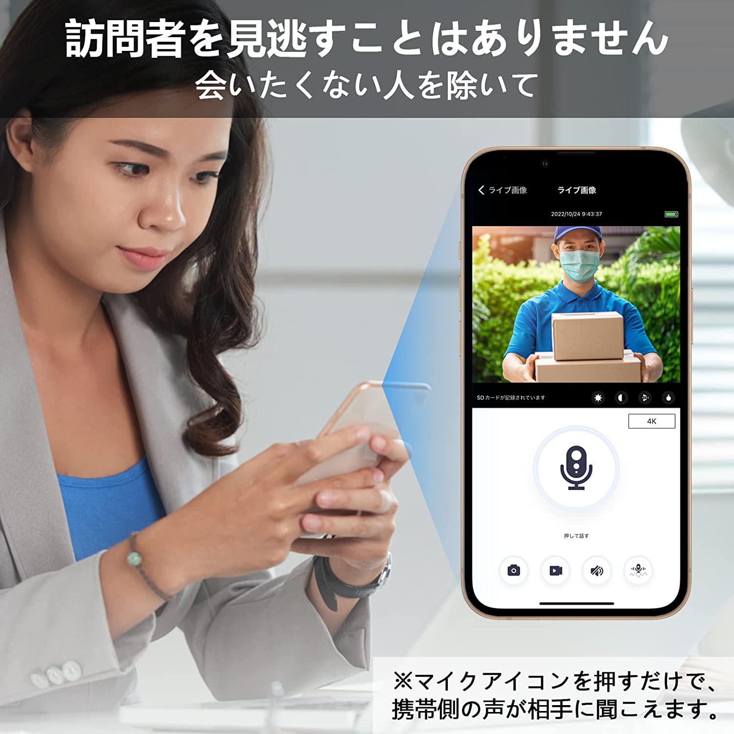 誰かがドアベルカメラを鳴らした後、ビデオドアベルが写真を撮り、すぐに携帯電話に通知を送信します。室内チャイムを搭載し、家の内外を問わず訪問者の記録を知らせ、どんな瞬間も逃しません。 訪問者が防犯カメラのドアベルを鳴らすと、スナップショットが撮られ、同時にあなたの電話に通知が送信されます。内蔵のマイクとスピーカーを使用すると、アプリを介してドアでゲストと見たり、聞いたり、チャットしたりできます。 内蔵のアップグレードされた WiFi チップは、より強力な WiFi 信号とより安定した WiFi 接続を提供します。 注: Wi-Fi は 2.4GHz ネットワークにのみ接続します。 インストールする場所で Wi-Fi 信号がカバーされていることを確認してください。 ドアベルマッチングするステップ 一.【TUYA Smart】アプリをダウンロードする スマホシステムに応じて選択して、APPをダウンロードしてください。 二.デバイスの追加 1.スマホの Bluetooth と位置許可機能をオンにします。 2.ドアベルボタンを押してデバイスを起動し、表示ライトが点滅します。 ネットワークモードに入ります。 3.アプリを開き「ホームページ」に入り、ページの右上隅にある「+」をクリックします。アプリは自動的にデバイスをスキャンして検出し、「追加」をクリックします。 三.ビデオドアベル本体を自宅のWIFIに接続する 自宅のWIFIの名称がすべて漢字の場合、ネットワークが利用できない可能性があります。 注: 接続に失敗した場合は、デバイスをリセットして再接続してください 注意事項 1.防水ではありません。 2.APP はドアベル ボタンでのみ起動でき、APP からドアベルを表示することはできません。 3.暗視モードでは白黒画像で、有効距離は 3.3 メートルを超えることはできません。 4.ルーターからの距離は 10 メートルを超えないようにしてください。 5.ビデオ ドアベルは 2.4 Ghz WiFi のみをサポートし、5G はサポートしていません。 ご注意 本商品は、電波法令で定められている技術基準に適合していることを証明する技適マークが貼付されていない無線機器であり、日本国内で使用する場合は、電波法違反になるおそれがございます。ご使用の際には、十分ご注意いただきますようお願いいたします。 詳しくは、最寄りの総務省総合通信局へお問い合わせください。