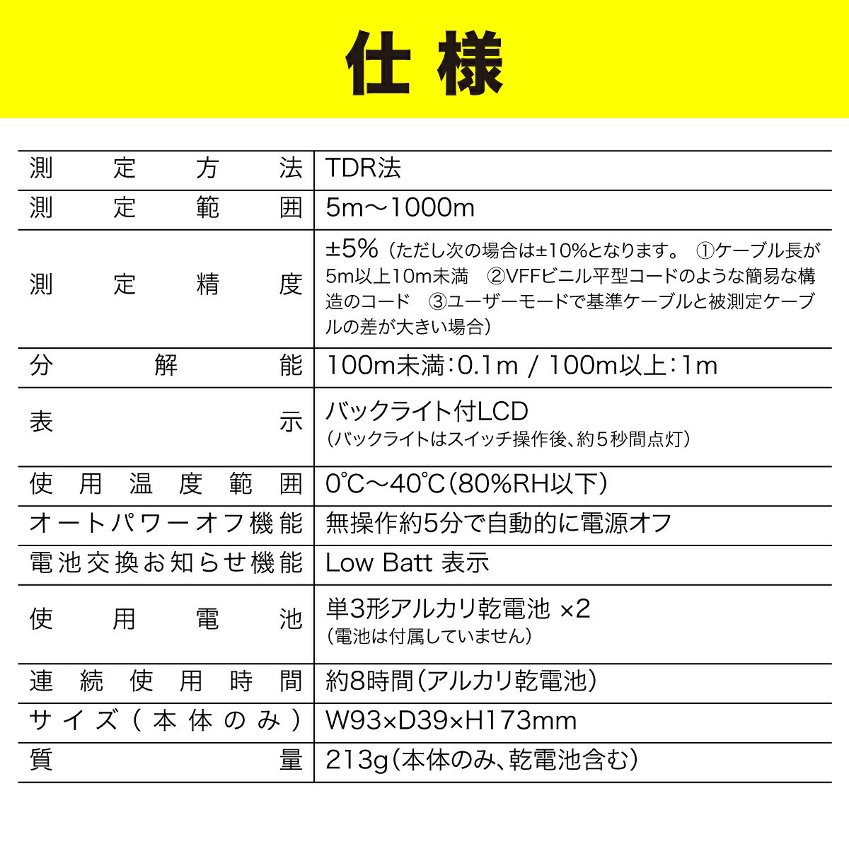 デジタル式 ケーブル測長器 ●1000mまでのケーブルの長さを素早く計測できる※1 ●50個までユーザーモードの登録が可能※2 ●本体をケーブルの一端に接続し、ボタンを押すだけの簡単操作。 ●ユーザーモードで、より正確に長さを測定できる。 また、メニューに無いケーブルの測定も可能。※2 ●アルミCVケーブルはユーザーモードで測長可能です。 ●バックライト付液晶で、暗いところでも見やすい。 (バックライトはスイッチ操作後、約5秒間点灯) ●用途に合わせて選べる付属ケーブル。 ●適合ケーブル(新たに150sq、250sqも追加!) ・VVF :φ1.6、φ2.0、φ2.6 (mm) ・VCTF :0.75、1.25、2.0 (mm?) ・同 軸 :3C-2V、3C-FV、5C-2V、5C-FV、5C-FB ・LAN :Cat5e、Cat6 ・600V CV :5.5, 8, 14, 22, 38, 60, 100,150, 200, 250, 325 (mm?) 600V CV(2心、3心、4心)、CVD、CVT、CVQに適合 ・その他2線以上のケーブル(ユーザーモード使用時) ※注意 エコケーブル、6600V CVケーブル、アルミCVケーブルは、ユーザーモードを使用してください。 ※活線不可 ●セット内容 ・本体 ・クリップ(小) ・クリップ(大) ・テストプローブ ・ケーブル1 ・ケーブル2 ■ 仕様 ・本体サイズ・質量(本体のみ、乾電池含む):93mm×39mm×173mm・213g ・測定方法:TDR法 ・測定範囲:5m〜1000m ・測定精度:±5% (ただし下記1〜3の場合は±10%となります) 1.ケーブル長が5m以上10m未満 2.VFFビニル平型コードのような簡易な構造のコード 3.ユーザーモードで基準ケーブルと被測定ケーブルの差が大きい場合 ・分解能:100m未満:0.1m / 100m以上:1m ・表示:バックライト付LCD (バックライトはスイッチ操作後、約5秒間点灯) ・使用温度範囲:0℃〜40℃(80%RH以下) ・オートパワーオフ機能:無操作約5分で自動的に電源オフ ・電池交換お知らせ機能:Low Batt 表示 ・使用電池:単3形アルカリ乾電池 ×2 (電池は付属していません) ・連続使用時間:約8時間(アルカリ乾電池)デンサン JEFCOM DENSAN DMJ-1000AB (DMJ1000AB)