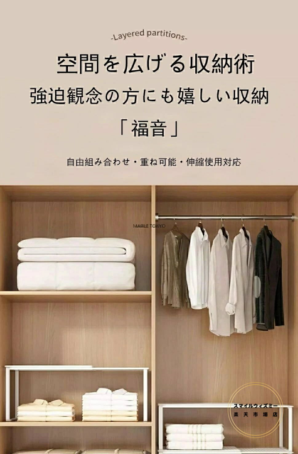 ウォードローブ収納!重ねて使える層別収納ラック 【重ねて、空間を 3 倍に】 1 つのラックでウォードローブ内を上下に仕切り、服や小物を「見える・取りやすい」状態に。1 段だけだったスペースを、コンパクトに 3 層収納へと生まれ変わらせます。 【 層別収納で「探す時間」ゼロ】 上からシャツ、ミドルに帽子やマフラー、下にシーツなど、用途別・季節別に分けて置ける。棚板の網目デザインなら、中身がすぐわかり、無駄な探し回りがなくなります。 【カーボンスチール + 塗装、丈夫さとデザイン両立】 カーボンスチール製のフレームは、重い荷物にもたわまず。また、塗装層が防錆・防食し、ウォードローブ内の湿気にも強い。白いデザインなら、どんなインテリアにも馴染みやすく、収納だけじゃなく「見た目の整理」にも貢献します。 ウォードローブがグチャグチャだったら、この 1 枚で解決。重ねるだけの簡単インストールで、即座に収納力アップ!