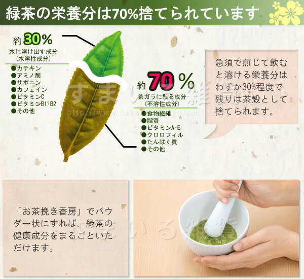 商品詳細 陶磁器でできたお茶用すり鉢です。 石臼の原理を応用し、すり棒とすり鉢の表面に細かいディンプル(凹み)加工を 施すことでお茶葉を素早く砕き、極め細やかで風味豊かな粉末茶を作ることができます。 このお茶挽き器によって、従来捨てられていた栄養たっぷりの茶殻もまるごと摂取することができます。 また、茶碗としても使用できるので、お湯などを注げばそのまま飲むことができ 茶殻も出ずに洗いが簡単、お手入れもラクラクです。 従来の機械式のお茶挽き器と違い手動で挽くため、好みの粗さにお茶を挽くことができます。 また、挽けば挽くほど細かなパウダー状になり、 喉に引っ掛からず風味豊かでまろやかな粉末茶に仕上げます。 すり棒とすり鉢は日本の瀬戸で焼き上げ高品質で、安心できる素材を使用しています。 すり鉢の底にシリコン製の滑り止めがセットされていて滑りにくく、 お茶を挽きやすい構造になっています。 SPEC 材質 すり棒・すり鉢/陶磁器 滑り止めゴム/シリコーンゴム(耐熱180℃) サイズ(約) すり鉢/ φ12×H8cm すり棒/ φ3.5×H15cm 重量(約) すり鉢(滑り止め付)/ 360g すり棒/ 150g 生産国 日本 付属品 ・すり鉢(滑り止めゴム付)…1個 ・すり棒…1本 ・レシピ+取扱説明書…1部緑茶の栄養まるごと! お茶挽き香房 知っていましたか? 毎日飲んでいる緑茶、その栄養分の約70%を捨ててしまっていることを! お茶として抽出されるのは全体のわずか約30%。それ以外は茶ガラとして 捨ててしまっているのです。 【お茶挽き香房】なら石臼の原理を応用した『Wティンブル加工』で お茶を素早く粉砕、粉末状にすることが出来ます。 お茶として飲むだけでなくお料理に混ぜて使えば、手軽に緑茶の栄養分を まるごと摂取できます。 香りに酔いしれながら、栄養までも美味しいお茶を頂きませんか?