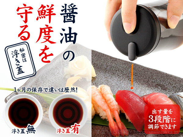 商品詳細 醤油液面に『浮き蓋』を浮かべることで、空気に触れる醤油の面積を減らし、 醤油の鮮度を保つことができる醤油さしです。 「ちょっと出し」「もうちょっと出し」「ずっと出し」 3種類の出具合を調節できる『穴あきボタン』付き。 数滴ずつかけられ、かけすぎを防止できるので、高血圧の方にも適しています。 穴を塞がずに注げば連続して出し続けられるので、調理のときに使いやすくなっています。 SPEC 材質(耐熱・耐冷温度) 本体/メタクリル樹脂(90℃、?40℃ ) 蓋、浮き蓋/ABS樹脂(80℃、?40℃ ) ボタン、パッキン/シリコーンゴム(270℃、?40℃) サイズ(約) 幅6.5×奥行6.5×高さ11cm 重量(約) 150g 生産国 中国 付属品 本体/1個 中チラシ兼取扱説明書/1枚 ※注意事項※ 酒や粘度の高いソースには使用できません。いつでも開けたて美味しさ長持ち 開けたてそのまま ずーっと美味しい醤油さし 醤油はいつの間にか酸化して風味が落ちてしまいます。 原因は「容器内の空気」。 新鮮なお刺身を新鮮な醤油で食べてみませんか? 「開けたてそのまま ずーっと美味しい醤油さし」なら、 いつでも新鮮な開けたてのおいしさを味わうことが出来ます。 また、注ぐ量を3段階に調節することが出来る『穴あきボタン』付き。 数滴ずつかけられ、かけすぎを防止できるので、高血圧の方にも適しています。 穴を塞がずに注げば連続して出し続けられるので、調理のときに使いやすくなっています。