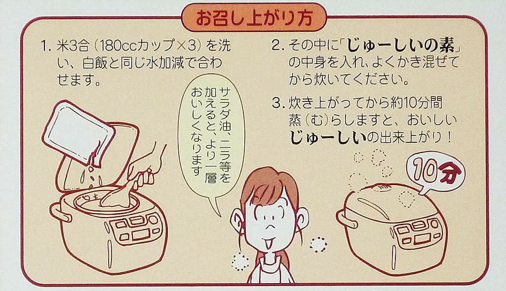 内容量:じゅーしいの素×5個 ※2025年10月より順に包材が箱→スタンドパウチへ変更となります。 カロリー:(100gあたり)エネルギー209kcal 原材料:野菜(にんじん、たけのこ、しいたけ)、豚肉、ひじき、しょうゆ、油揚げ、砂糖、食塩、動物油脂、酒、鶏がらスープ、鰹だし、調味料(アミノ酸等)、カラメル色素、(原材料の一部に小麦、乳、大豆を含む) 商品サイズ(高さx奥行x幅):175mmx125mmx130mm