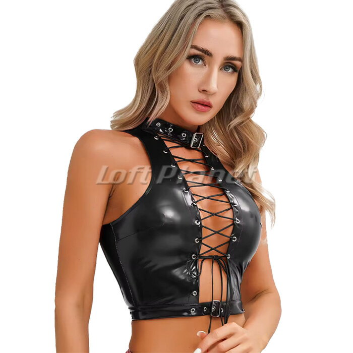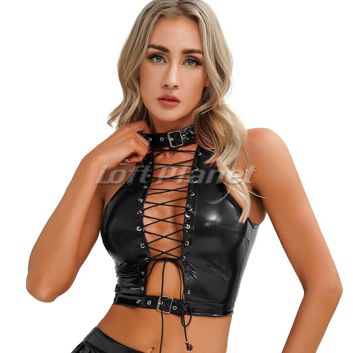 セクシー クロップトップ PUエナメル チョーカー付 編み上げ トップス ビスチェ ホルターネック クラブ ダンス ボンテージ 黒 AE250630BK