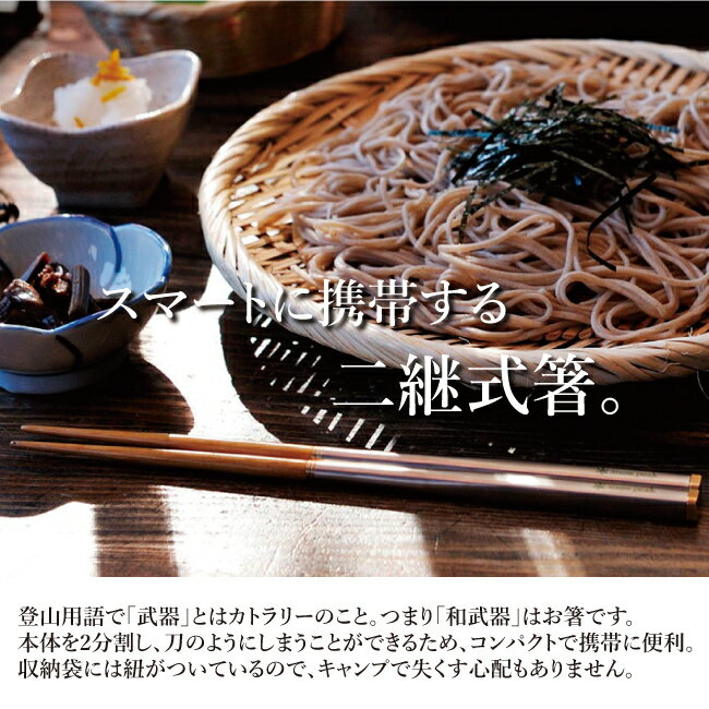 メーカー希望小売価格はメーカーカタログに基づいて掲載していますSpec ブランド名 Snow Peak スノーピーク 商品名 和武器 M メーカー型番 SCT-110 サイズ 8×8×205(h)mm (収納時約113mm)収納ケースサイズ:38×143(h)mm※メーカーサイズ参照 カラー 詳細 コンパクトに収納できる携帯に便利なマイ箸。登山用語で「武器」とはカトラリーのこと。つまり「和武器」はお箸です。本体を2分割し、刀のようにしまうことができるため、コンパクトで携帯に便利。収納袋には紐がついているので、キャンプで失くす心配もありません。お弁当用や普段からの持ち歩きにもオススメです。重量:本体/約26g、ケース/約14g特長:登山用語で武器はカトラリー。和武器は、つまりお箸です。 キャンプで箸を使うことを当たり前にした逸品。2分割して刀のようにしまう姿は、海外でも大人気です。材質:グリップ/ステンレス、ティップ/竹、ジョイント・フタ/ブラス・ゴム、ケース/ポリプロピレン ------------------------------------------------------------ ※モニタやPC環境等により実物と多少色合いが異なって見える場合もございます。※外箱がある商品につきましては生産、運搬の過程上、商品の箱(外箱)に多少の汚れや、破れ等が生じる場合がございます。 予めご了承の上お買い求め頂きます様、よろしくお願いいたします。 ※パターン生地を使用している商品によってはパターン位置に個体差がございます。予めご了承下さい。 ※一部商品画像にメーカー提供画像を使用している商品もございますので、仕様が予告なく変更される場合がございます。 ※複数のショッピングモールで同時販売しておりますので、在庫切れになってしまう場合がございます。 厳重に注意し在庫システムで管理を行っておりますが、お買い上げいただいた商品が品切れになってしまう場合がございます。 また、人気商品に関しましても複数のお客様が一度に購入を行い、在庫の反映が間に合わずご購入できてしまう場合がございます。 その際はお客様には必ずご連絡をさせていただきますが、万が一入荷予定がない場合はキャンセルさせていただく場合がございます。 大変申し訳ございませんがあらかじめご了承ください。 ※メール便発送対象商品に関しましては、メール便規定料金にてお送りします。 ※ガス缶などをご使用いただく商品の場合、同メーカーのものをご使用いただくことを推奨しております。製品不良などが起こった場合、保証対象外となる場合がございます。 ------------------------------------------------------------