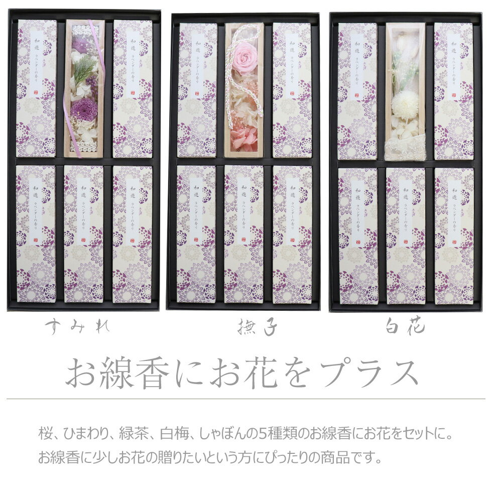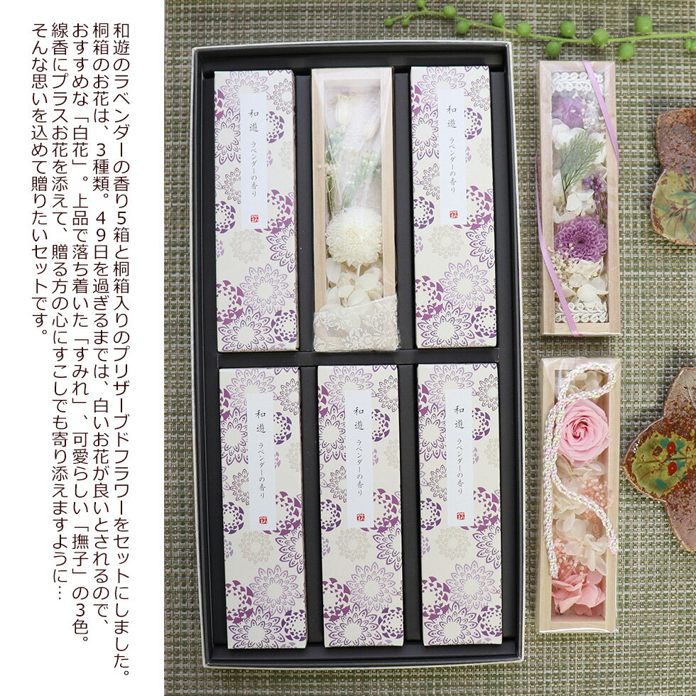 ラベンダーが楽しめるお線香とプリザーブドフラワーの小さな桐箱入りのお供え花のセットです。 お線香だけじゃ少し寂しい… そんな方にぴったりな小さなお供え花をプラスしたセットです。 商品サイズ 箱 :約172×L335×H33mm ◆お線香について 「日々の暮らしに、 遊び心と和心を。」 「ちょっとした和」「ちょっとだけ和」、そんな感覚で和を取り入れてみると気持ちが和んだり、豊かな気分になったしませんか? 日々の暮らしに遊び心と和心をコンセプトにパリと京都のデザイナーが国境を越えてコラボレーションした遊び心ある和モダンデザインシリーズです。 ラベンダー香りが楽しめる線香の進物。女性好みの、はんなりと美しい進物です。 お彼岸やお盆、年末年始のご挨拶、お悔みなど 季節を問わずご利用頂ければと思います。 〇ラベンダーの香×5。 内容量 :各約30g 容量 ※燃焼時間約25分 ◆ お花について プリザーブドフラワーの桐箱アレンジ。白花、すみれ、撫子の3色からお選びいただけます。 49日までは白いお花が(白花)がおすすめです。 〇花材(プリザーブドフラワー) 白花:小菊、フローレンティナ、モリソニア、アジサイ 撫子:バラ、アジサイ、カスミソウ すみれ:小菊、カスミソウ、アジサイ、千日紅 〇花サイズ:約15×4×2cm 〇器:桐箱 ●お悔やみ文面、のし名入れ 無料で承ります。 メッセージ例 ★お悔やみ このたびのご逝去を悼み、 謹んでお悔やみ申しあげますとともに、 心よりご冥福をお祈り申し上げます。 ★ お悔やみ この度は思いがけないご訃報に接し、 信じられない思いでおります。 ご生前のご厚情に深く感謝するとともに、 心よりご冥福をお祈り申し上げます。 ★新盆・初盆 新盆を迎えるにあたり、遠方より合掌させていただきたいと思います。 ささやかですが、お花を贈らせて頂きました。ご仏前にお供えください。 ★回忌法要 一周忌にあたり、 心ばかりのお花を贈らせていただきました。 改めて故人のご冥福と、ご家族皆様のご健康をお祈り申し上げます。 ご参考にしてください。 【様々なシーンでご利用いただいております】 お悔やみ・お供えなどにおすすめです。 季節の行事一覧 1月 第2月曜:成人の日 2月 14日:バレンタインデー 3月 3日:ひな祭り 14日:ホワイトデー 21日:春分の日(お彼岸) その他、卒業・謝恩会・合格祝い・人事異動・転勤・退職・栄転・昇格 4月 入学・就職 5月 5日:こどもの日 第二日曜日:母の日 6月 第三日曜日:父の日 7月 初旬〜20日頃:御中元 15日:お盆 下旬〜8月初旬:暑中見舞い 8月 初旬:暑中見舞い 15日:月遅れ盆 初旬から下旬:残暑見舞い 9月 15日:敬老の日 23日:秋分の日(お彼岸) 10月 31日:ハロウィン 11月 3日:文化の日 15日:七五三 下旬〜12月20日頃:お歳暮 12月 〜20日頃:お歳暮 24日:クリスマスイブ 25日:クリスマス 末頃:お年賀ご予約ラベンダーの香りが楽しめるお線香とプリザーブドフラワーの小さな桐箱入りのお供え花のセットです。 お線香だけじゃ少し寂しい… そんな方にぴったりな小さなお供え花をプラスしたセットです。 和モダンなデザインが印象的な和遊のお線香。 ご供養はもちろん、お香としても使える現代的な香りのラインナップはリビング供養にもオススメです。 そっと手を合わせるとき、静かなときが流れる お線香の香りは身と心を清浄にし、すみずみまで行き渡るところから、全ての人に行き届く慈悲の薫りを表しています。お彼岸やお盆、年末年始のご挨拶、お悔みなど 季節を問わずご利用頂ければと思います。日々の暮らしに遊び心と和心を いつもの暮らしの中に「なんとなく和」「ちょっとだけ和」・・・ そんな感覚で和を取り入れてみると少しだけ気持ちが和んだり、豊かな気分になったりしませんか? 桐箱の中にそっと気持ちを添えれるプリザーブドフラワーの桐箱アレンジをセットにしました。お色はピンク系の撫子、紫系のすみれ、白系の白花の3色からお選びいただけます。贈る方に合わせてお選びください。かわいいピンクのお供え花。お子様やペットなどのお供えに。 上品な紫と白のお供えアレンジ。小菊や千日紅が上品な色合いの使いやすいデザイン。 白×グリーンのプリザーブドフラワーの桐箱アレンジ。49日までは白が良いとされています。やさしいお花が癒しを与えてくれそう。 ・ちょっとした気持ちのお花をお線香にプラス。お花が線香の中にあるだけで、気持ちに寄り添えそうですね。 のしやメッセージカードをお付けできます。ご注文時にお申し付けくださいませ。