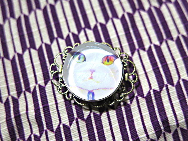 メール便OK!キュート!オッドアイキャット白ねこの帯留め&ブローチ便利なスグレモノ!2ウェイで使えるクリアなガラスのきれい発色!バッグや帽子に。セーターやジャケットに!3分紐に使える和装小物ギフトにもシャレてるね!