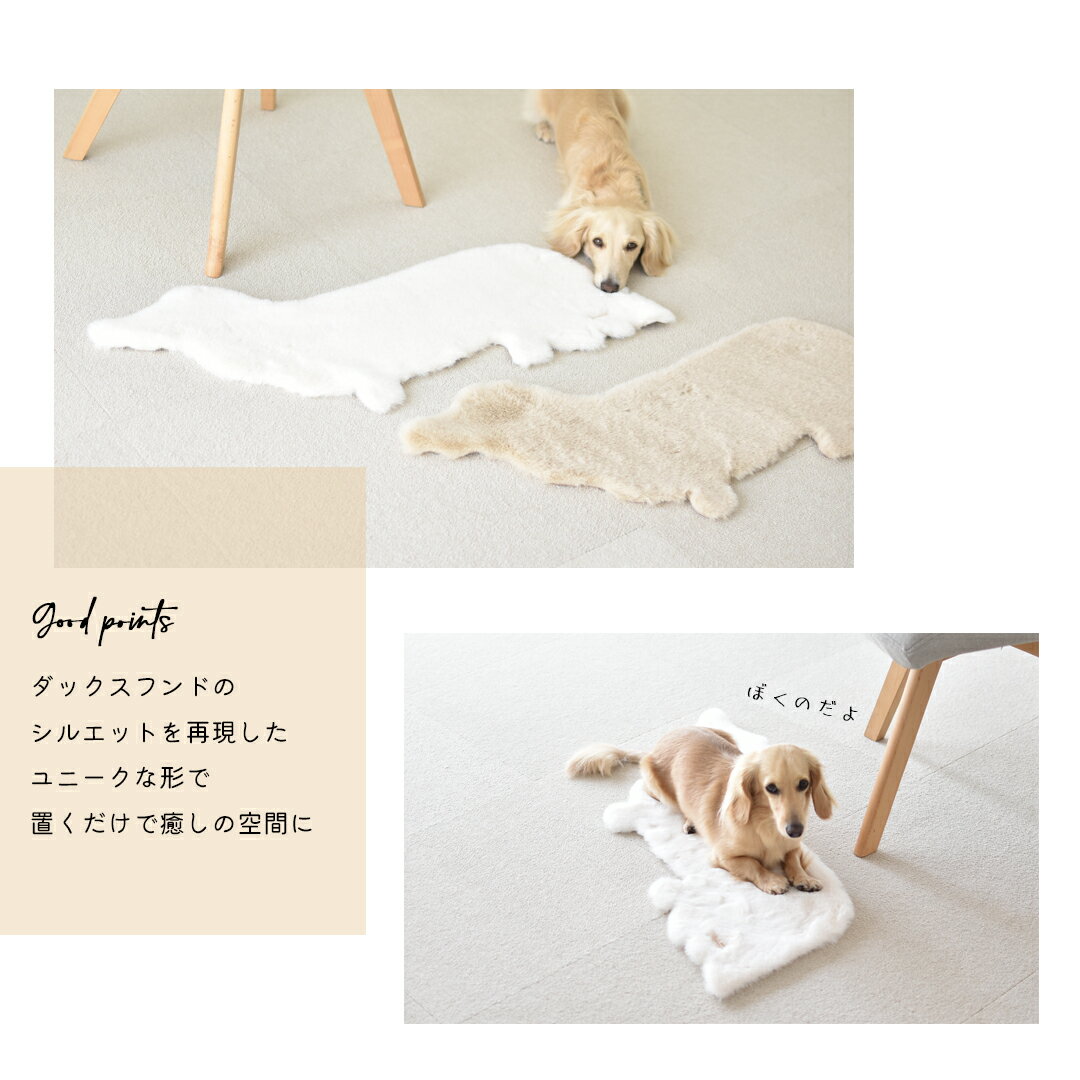 商品について 特 徴 ダックス好きに贈る可愛さと心地よさを詰め込んだマット お部屋にふんわり癒しを添える、ダックス型のもこもこマットです。 長めの毛足がとにかく気持ちよく、まるでぬいぐるみのような優しい肌ざわり。 床に敷いた瞬間、つい触れたくなる心地よさです。 裏面はスエード調素材で、滑りにくく安心の設計。 玄関マットやソファ前、ベッドサイドやペットのくつろぎスペースなど、様々なシーンで活躍します。 犬好きの方へのギフトにもぴったりな、見た目も癒し力も抜群のアイテムです。 素材 上記画像をご参照ください。 サイズ 上記画像をご参照ください。 カラー ・ホワイト ・ベージュ ・レッドブラウン ・ブラック 注意事項 ※できるだけ設定実寸での仕上がりとなるよう生産しておりますが、若干の個体差がありますので、+−1〜2cm程度の誤差はご了承いただきますようお願いいたします。 ※PC画像・光により実物と画像のカラーが異なる事があります。 出来る限り近いお色の物にさせて頂いておりますがご了承下さい。 ※他店販売もしていますので確認・注意はしていますが店頭にて品切れの場合、 キャンセルさせて頂く事があります、御了承下さい。 DOGサイズ・DOGモデルについて詳しくはこちらから→