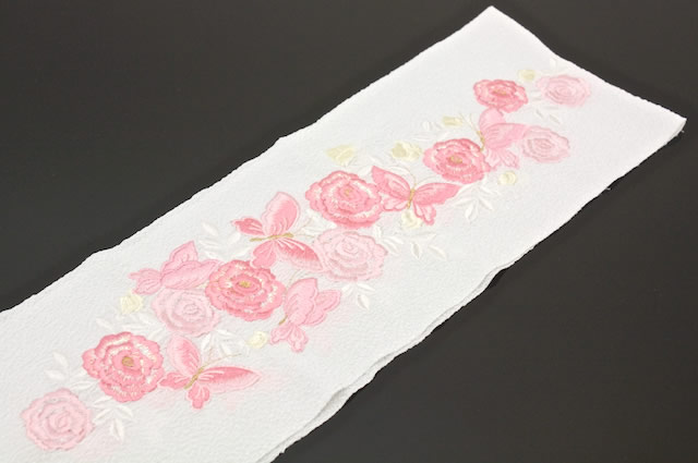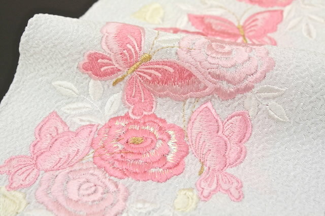 【20%OFFクーポン】決算大感謝祭|2/15~28半襟 刺繍 半衿 洗える刺繍半衿 白×濃いピンク バラ 蝶々 鬼縮緬 日本製