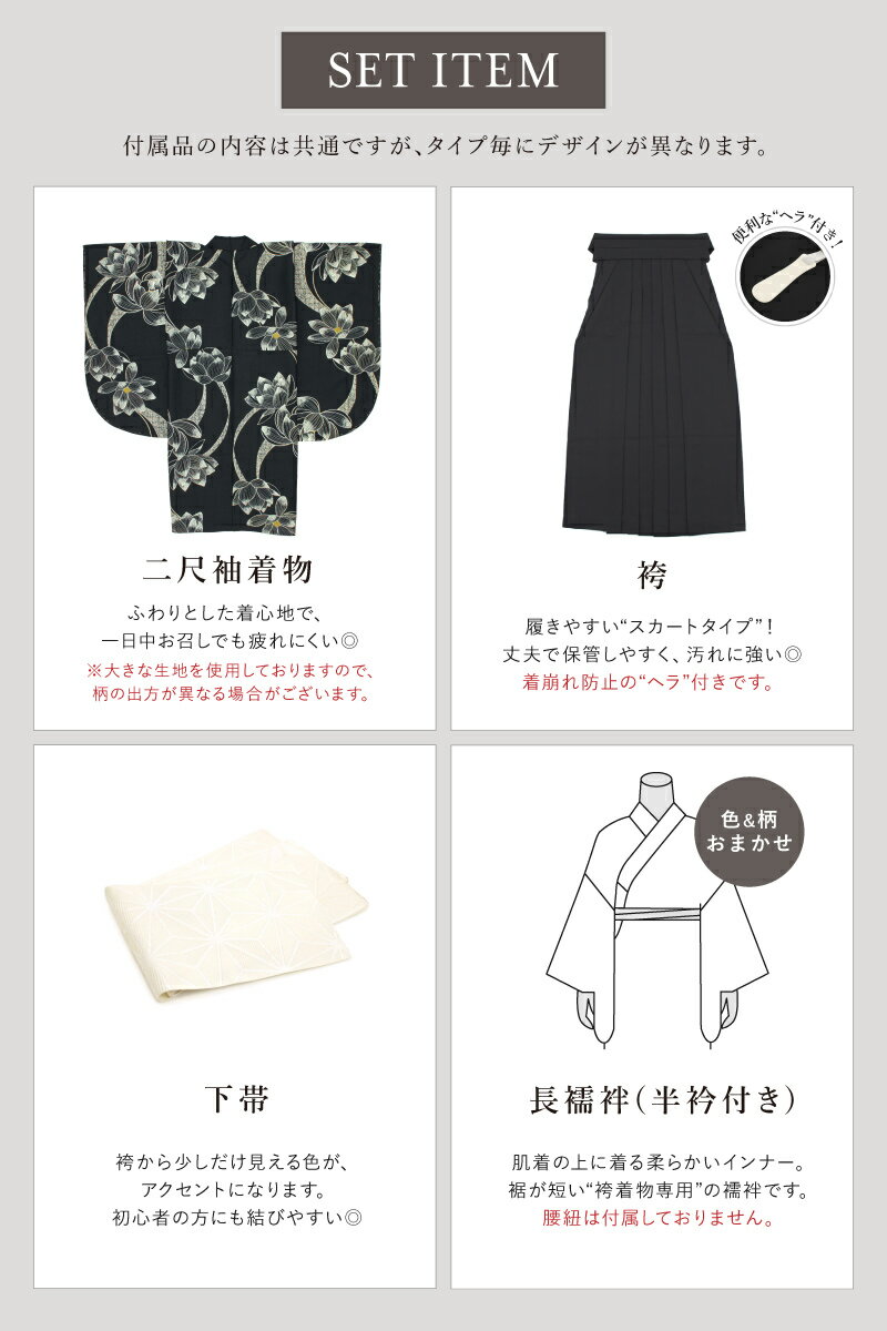 商品詳細spec.商品番号assort-hmset0065素材着物:ポリエステル100%袴:ポリエステル100%注意事項※【C】【E】は予約商品です。【E】は1月上旬、【C】は2月中旬以降順次出荷予定です。※通常商品と同時購入の場合、予約商品が入荷次第、一括での発送となります。ご注意ください。※セット内容の一部変更や、それに伴う値引きは承っておりません。※襦袢の色柄はご指定いただけません。また腰紐は付属しません。※モデル着用の商品が実際の色よりも明るく見える場合があります。※着物の柄部分は大きな生地を使用して作られておりますので、色や柄の出方、模様の配置等が画像と異なる場合がございます。 サイズ表身丈袖丈裄丈サイズ約110cm約76cm約68cm紐下対応身長SS(2尺2寸)約83cm138-145cmS(2尺3寸)約87cm145-153cmM(2尺4寸)約91cm153-160cmL(2尺5寸)約95cm160-170cmLL(2尺6寸)約99cm170-175cmSOUBIENのおすすめポイントSOUBIEN についてSOUBIEN(創美苑)では、卒業式 袴 セット 袴セット ジュニア レディース 大人 女性 女 女の子 大学生 学生 小学生 小学校 ハイジュニア モダン レトロ レトロモダン アンティーク 大人 かわいい かっこいい カッコいい おしゃれ はかま はかまセット 袴用 袴向け 袴向き おとな 販売 購入 レンタルより安い レンタルより安価 アイテム など、多数の商品を取り扱っております。どんなシーンやイベントに着用できますか?卒業式 卒業 大学生 大学 小学生 小学校 成人式 和装 和服 謝恩会 先生 先生用 教員 写真 写真撮影 セレモニー お呼ばれ パーティー 晴れ着 晴れの日 十三参り 十三詣り コスプレ 販売 通販 購入 旅行 ギフト プレゼント 海外の方へのプレゼント といった様々なシーンにオススメです。SOUBIENの取扱いカラー・柄について色柄のお取り扱いは、白 ホワイト アイボリー 生成色 生成り色 赤 レッド 赤系 臙脂 エンジ 桜色 桃色 ピンク 黄色 イエロー クリーム 青 ブルー 水色 緑色 グリーン 黄緑 橙 オレンジ 紫 パープル 茶色 ベージュ ブラウン 黒 ブラック カラー マルチ マルチカラー カラフル 和柄 古典柄 花柄 花 フラワー 華 縞 縞柄 ストライプ 矢絣 矢羽 矢羽根 市松 市松格子 チェック柄 縮緬 ちりめん 無地 など 豊富なカラー、デザインをご用意しております。是非、お気に入りの商品をお求めください。卒業式向け袴4点セット卒業式や大切な記念日を彩る袴セットです。内容は【着物・袴・下帯・襦袢】の4点セットです。着物は、身丈が短く動きやすい半着タイプです。袴は、合わせやすいシンプルな無地です。中仕切りがない行灯袴(あんどんはかま)ですので、洋服のスカートと同じようにお召しいただけます。ご自宅でもお手入れしやすいので、着物での一日を存分にお楽しみいただけます。こだわりの袴セットで、思い出となる記念日をお迎えください。きもの館SOUBIENのプライベートブランド『floro by SOUBIEN』(フローロ)の二尺袖着物を合わせた華やかな袴セットです。『floro by SOUBIEN』(フローロ)は、移りゆく和装トレンドの最先端を常に追い求め、「欲しい」「着てみたい」を作り出す、きもの館SOUBIENのプライベートブランドです。ジャンルや系統に縛られず、あらゆるシーンに求められる和装スタイルを展開し、今流行りの人気を押さえ、和装のお洒落を魅せたいという想いをコンセプトに真心を込めて作りました。