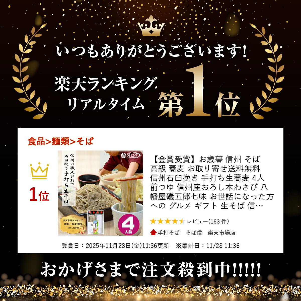 【金賞受賞】お歳暮 信州 そば 高級 蕎麦 お取り寄せ送料無料 信州石臼挽き 手打ち生蕎麦 4人前つゆ 信州産おろし本わさび 八幡屋礒五郎七味 お世話になった方への グルメ ギフト 生そば 信州そば 引越し お祝い 内祝 誕生日 長寿食 ルチン 御歳暮 年越し