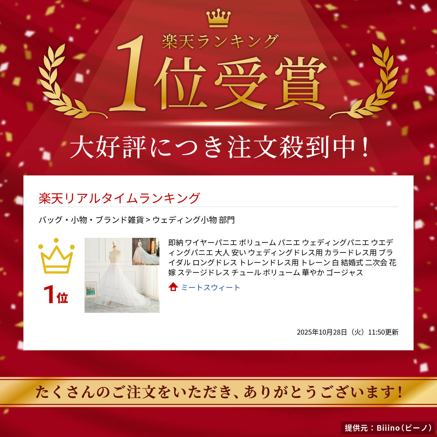 【重要なお知らせ】 平素より「ミートスウィート」をご愛顧いただき、誠にありがとうございます。 このたび、当店の商品画像(当店ロゴ入り)を無断で使用した他店舗の類似商品が流通していることが確認されました。 ★★当店の商品画像(ロゴ付き)を無断使用している他店舗の商品は、当店とは一切関係ありません★★ 当店は他店舗の類似品については一切責任を負いかねます。 何卒ご理解のほどよろしくお願い申し上げます。 ウェディングドレス/カラードレスのプリンセスライン/トレーン対応 セット内容:パニエ1点 カラー:ホワイト 素 材:ポリエステル、ワイヤー サイズ: ウエスト:60-100cm 前丈:100cm 後ろ丈:140cm ワイヤー前から後ろまで:130cm ワイヤー左から右まで:90cm ※ワイヤーがスライドできますので多少の調節が可能です。 ※ウエストはゴムと紐式となっており、多少のサイズ調整可能です。 ※作製時期により若干個体差がある場合がございます。 ※生地に小さな穴があいていることがございます。パニエの作成過程で発生するものですので、あらかじめご了承下さい。 キーワード:プリンセスラインドレス ドレスインナー 演奏会 発表会 ウエディングドレス ウェディングドレス ブライダル 花嫁 二次会 披露宴 パーティー イベント オペラ チマチョゴリ ステージドレス 舞台衣装 演出服 お姫様 仮装 コスプレ コスチューム 豪華 ゴージャス 大人 ひきすそパニエ 大きいサイズ パニエ ワイヤーパニエ ボリューム 大人 安い ウェディングドレス用 ブライダル ロングドレス トレーン 白 結婚式 二次会 花嫁 ウエディングドレス チュール パニエ ウェディングドレス カラードレス ステージドレス"※お届け先が沖縄、離島の場合は送料1000円追加いたしますので、ご了承ください。