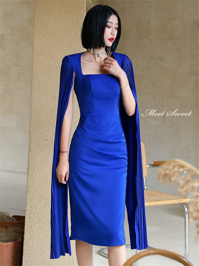 カラードレス カクテルドレス パーティードレス フォーマルドレス ロイヤルブルー スリットスリーブ ミディアム丈マーメイドワンピース 明るい青 ゲストドレス イブニングドレス ウェディングドレス ウエディングドレスファスナー タイト 大人 おしゃれ ファッション