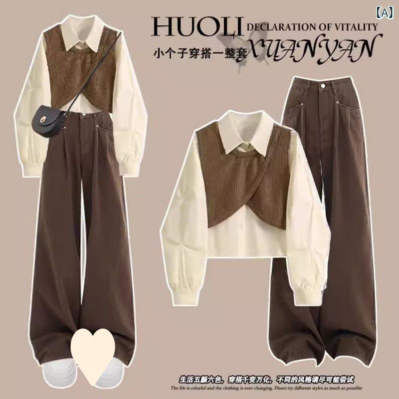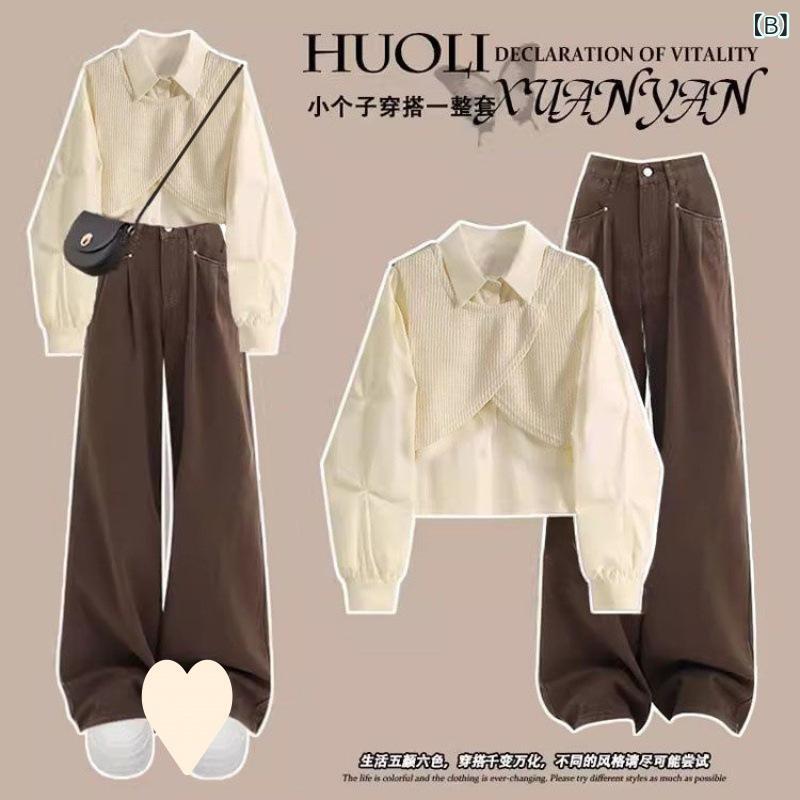 セットアップ レディース 春秋 韓国 ブラウス シャツ + ハイウエスト ワイドレッグ デニム パンツ 2点 セット