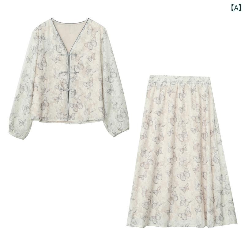 セットアップ レディース 大きいサイズ 春夏 ブラウス 茶系 スカート 2点セット 蝶 Vネック 半袖 ゆったり チュニック