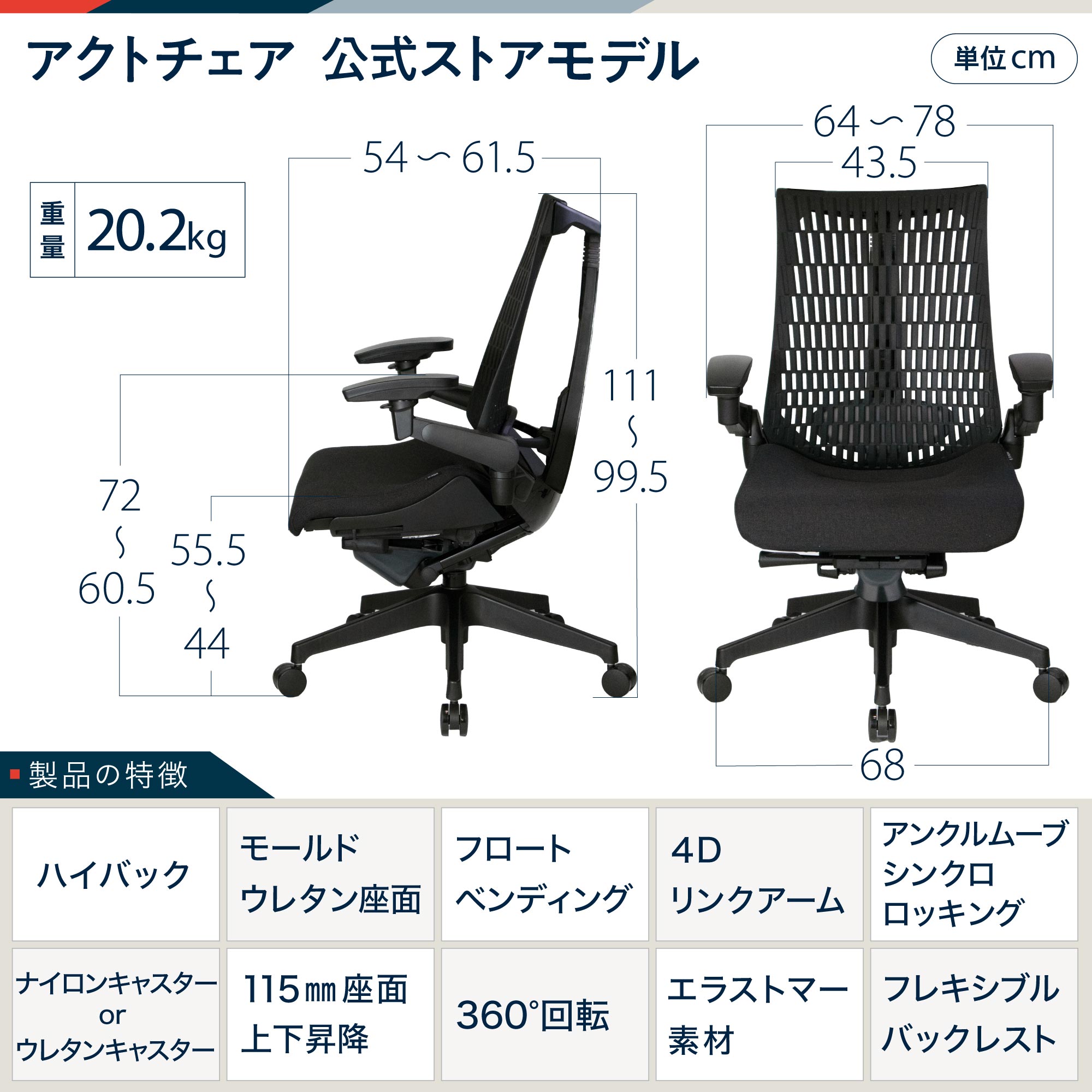 仕様・規格カテゴリオフィスチェア > ハイバック > アジャスタブル肘付仕様ハイバック / 背面エラストマー素材 / 4Dアームレスト / ランバーサポート付き機能アンクルムーブ・シンクロロッキング、シートアングルストッパー、ロッキング強弱簡易調節、ベンディングシート、ガス上下調節、座の奥行調節 サイズ幅W:64~78 cm奥行D:54~61.5 cm高さH:99.5~111 cm座高SH:44~55.5 cm / 座面厚み:約3.7 cm材質背:エラストマー樹脂 座:SA張地 背ブラケット:強化ナイロン樹脂 肘当て:発泡ウレタン一体成型 肘受け:強化ナイロン樹脂 脚:強化ナイロン樹脂 キャスター:ナイロンまたはウレタン 重量20.2 kg デザインITOKI( イトーキ )製品記号□ブラックナイロン双輪キャスター:KG427SAT1T1T1C抵抗付ウレタン双輪キャスター:KG427SAMT1T1T1C□ダックブルーナイロン双輪キャスター:KG427SAGNB4A4C抵抗付ウレタン双輪キャスター:KG427SAMGNB4A4C□ホワイトグレーナイロン双輪キャスター:KG427SAW9T7T6C抵抗付ウレタン双輪キャスター:KG427SAMW9T7T6C生産日本製配送宅配便保証最大3年(JOIFAオフィス家具ガイドライン準拠)備考 ・完成品にて発送します。※ご覧の環境により、画面上での色と実際の色の見え方が異なる場合があります。あしからずご了承ください。商品について【Actのコンセプト】アクトチェアは、アジャスト&アクティブというコンセプトのもと、ワークパフォーマンスを高めるための理想の座り心地を追求したタスクチェアです。背と座を一体につないだような一体感のあるモノフォルムデザインを採用し、腰部をしっかりとホールドする機能と美しさを兼ね備えたデザインが特長です。【スマートで軽やか・サイドフレームレスデザイン】アンカー形状の支柱で身体を支える構造により、両サイドのアウターフレームを不要にしたスマートなシルエットです。肩から背中にかけて、背のサイド部分が柔軟なため、身体を動かしたときのストレスが軽減されます。【快適な座り心地・こだわりの座面】座面中央部はクッション厚37mmのモールドウレタン製。おしりを包み込むようなバケット型の座面形状です。座面内部は空洞で、細かいスリットを入れたインナーシェルを左右から吊った構造のフロートベンディングを採用。坐骨周辺に集中しがちな体圧を分散し、快適な座り心地を実現。また、スリットから体温を発散し、ムレを防ぎます。【膝裏の圧迫感を軽減】座面奥行は7段階(調節幅:75mm)で調節可能。座面中央部のポジションはそのままに前縁部が折れ曲がる方式を採用しているため、座り心地はそのままに、体格に合わせたポジショニング設定が行えます。【新感覚のフレキシブルバックレスト】フレキシブルバックレストは支柱に備えたピボット構造により、肩の回転にしなやかに追従し、上半身の左右の動きに自然とアジャストします。集中からリフレッシュまで、フレキシブルに身体の動きをサポートします。【高機能エラストマー素材】背もたれにエラストマー素材を採用。樹脂とゴムの中間的なエラストマー素材は、柔軟性と耐久性を備えており、上半身の動きに柔軟にフィットします。短冊型のメッシュデザインは、通気性に優れ、蒸れにくく快適な座り心地です。また、メンテナンス性に優れた耐アルコール性能を備えています。【肘の位置が瞬時に定まる・4Dリンクアーム】腕を支える肘当ては調整用レバーを持ちながら動かすだけのワンアクションで調整可能。常に最適な肘位置をキープすることで、身体にかかる負担・疲労を緩和することができます。肘当て可動範囲(上下:120mm、前後:50mm、アーム回転:内側20°/外側10°、肘パッド回転:内側15°/外側15°)。【快適なシンクロロッキング】体重を後ろにかけると、くるぶしを支点に座面と背もたれが連動して傾くアンクルムーブ・シンクロロッキングを採用。座面の前縁が上がらず大腿部の圧迫がありません。腰と背を常に安定して支えてくれます。背の最後傾角度:20°。ロッキング角度は5段階で固定可能。【腰への負担を軽減・ランバーサポート】7段階で調整可能(60mm範囲)なランバーサポートは体格に合わせて効果的に調整できます。S字カーブを描く理想的な姿勢をサポートし腰への負担を軽減します。【115mm座面上下昇降】座面高は約44.0cm〜55.5cmの間で調整可能。利用シーンや体格に合わせて、使いやすい高さでご使用いただけます。【360°回転】座ったままくるっと向きを変えられます。快適な座り心地のよさで長時間のデスクワークもしっかりサポートしてくれます。【操作しやすい各種調節レバー】調節レバーはすべて座面右下に配置しています。(1) ロッキング角度固定レバー:レバーを上方向(固定)下方向(解除) (2)ガス上下調節レバー:レバーを上方向に持ち上げる。 (3)ロッキング強弱調節ハンドル:回転して強弱を5段階で調節可能。(4)座面奥行調節レバー:両サイドのレバーを前後に7段階で調節可能。【便利な説明書収納ポケット】座面裏に取扱説明書を収納できるポケットを用意しています。操作方
