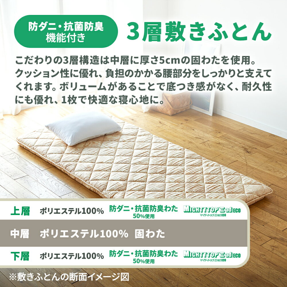 ■防ダニ・抗菌防臭機能付きで清潔にお使いいただける、3層敷きふとん こだわりの3層構造は、上層と下層のポリエステルわたの50%に防ダニ・抗菌防臭効果のあるテイジンのマイティトップII ad ECOを使用しております。 中層の固わたは、負担のかかる腰部分をしっかりと支えてくれます。 ボリュームがあることで底つき感がなく、耐久性にも優れています。 ポイント1 上層と下層のポリエステルわたの50%に防ダニ・抗菌防臭効果のあるテイジンのマイティトップII ad ECOを使用しております。 ーマイティトップII ad ECOの特徴ー ・防ダニ 高い忌避効果を発揮し、ダニを寄せつけにくくします。 ・抗菌防臭 ニオイの原因となる繊維上のバクテリアの増殖を抑制することで防臭効果を発揮します。 ポイント2 中層の固わたは、負担のかかる腰部分をしっかりと支えてくれます。 厚みはボリュームのある5cm厚。クッション性に優れ、しっかりと体を支えてくれます。 対応カバーのサイズ SL 105×215cm 【3層構造】 上層:ポリエステルわた(防ダニ・抗菌防臭わたマイティトップII ad ECO50%使用) 中層:ポリエステル固わた 下層:ポリエステルわた(防ダニ・抗菌防臭わたマイティトップII ad ECO50%使用) ■発送についてのご注意事項 商品の出荷のご連絡から、お届けまでに3~4日ほどかかります。 配送日時の指定はできかねますのでご了承ください。 ※配送業者の配送状況によっては前後する可能性がございます。 その他 商品の表側、裏側は、品質表示タグに記載の【品質表示の文字】が上になった状態が表側になります。 こちらはシングルのみの展開になります。 ※こちらの商品は厚み約9.5cmになります。 組成: ・ふとんがわ 表地:綿100% /裏地:綿100% ・詰めもの 上層:ポリエステル100%/中層(固わた):ポリエステル100%/下層:ポリエステル100% サイズ:SL 100×210cm 生産国:日本製