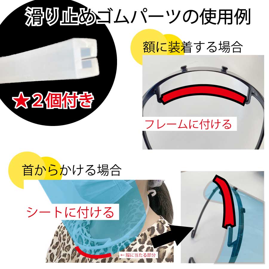 ※シートは無色透明です。 ※発送はメール便(ゆうパケット)でお送りいたします。 ※メール便のため、代引き決済はご利用できません。また、配送日時の指定もお受けできません。 ※本商品単体での発送となります。他の商品との同梱はできません。 神奈川大学 道用 大介 准教授監修 フェイスシールド 交換用シート 熱を逃して曇りにくい。シートには片面に曇り止め機能付き シートの交換が可能なフェイスシールド。 安心の日本製 締め付け強度は輪ゴムで調整 メガネの上から装着可能 台所用中性洗剤で、繰り返し洗えます 曇り止め加工のため、アルコール消毒不可です。 5セットでの販売です。 セット内容(フレーム5個、シート5枚、滑り止めゴムパーツ2個)セットでの販売です。 ご注文は、下記のフレームのお色の組み合わせよりお選びください。 【黒フレーム 5セット】 【白フレーム 5セット】 有限会社大高製作所 製造モノづくりの原点、横浜の町工場・金型屋さんが製造した日本製です。 交換用シート【 品番:OM2630 】 PET 製 ( ポリエチレンテレフタレート ) サイズ:横30×縦26cm 【黒いフレーム】PC製(ポリカーボネート) 【白いフレーム】PP製(ポリプロピレン) ゴムパーツ【 品番:A7001 】 サイズ:長さ9cm 入り数:1本素材:シリコーンゴム 【特徴】 ・メガネを装着したままでも使用できます。 ・フレームとシートが脱着できます。 ・くもり止め可能は片面のみです。どちらの面に加工されているかは、軽く息を吹きかけてご確認ください。 ・傷がついたらシートだけの交換もできます。 ・脱着できることで、別々に台所用中性洗剤で丸洗いできます。 洗浄後は、食器乾燥機は使わず、水分を拭き取って下さい。 ※フレームは普通に洗えますが、シートは大変傷に弱いです。 硬いスポンジなどでは洗わないでください。 汚れた部分だけ優しく手洗いが推奨です。 傷が目立って気になりましたら、新しいものと交換してください。 ・フレームとシートの脱着が自由なので、外せば薄くなります。出張時など、カバンに入れて持ち運びやすいです。 ・様々な頭の大きさの方々に対応できるよう、フックがついています。締付強さを、身近な輪ゴムなどで調整できます。 ・輪ゴムは、通常のものでも問題ありませんが、髪の毛の長い方は絡みやすいと思いますので、髪留め用のゴムなどで調整してください。 (※注意:この商品に輪ゴムは含んでいません) ・暑い環境下で汗をかきにくいよう、おでこに対する接点が少なめです。 ・おでこに当たる部分は穴が開いており風通しができて蒸気や熱を逃がしやすくなっています。 【配送について】 ・ゆうパケットにて発送いたします。 ・送料無料です。 専用の装着用フレームは黒・白の2色です。 【ショートサイズ5個セットはこちら】 【ロングサイズ5個セットはこちら】
