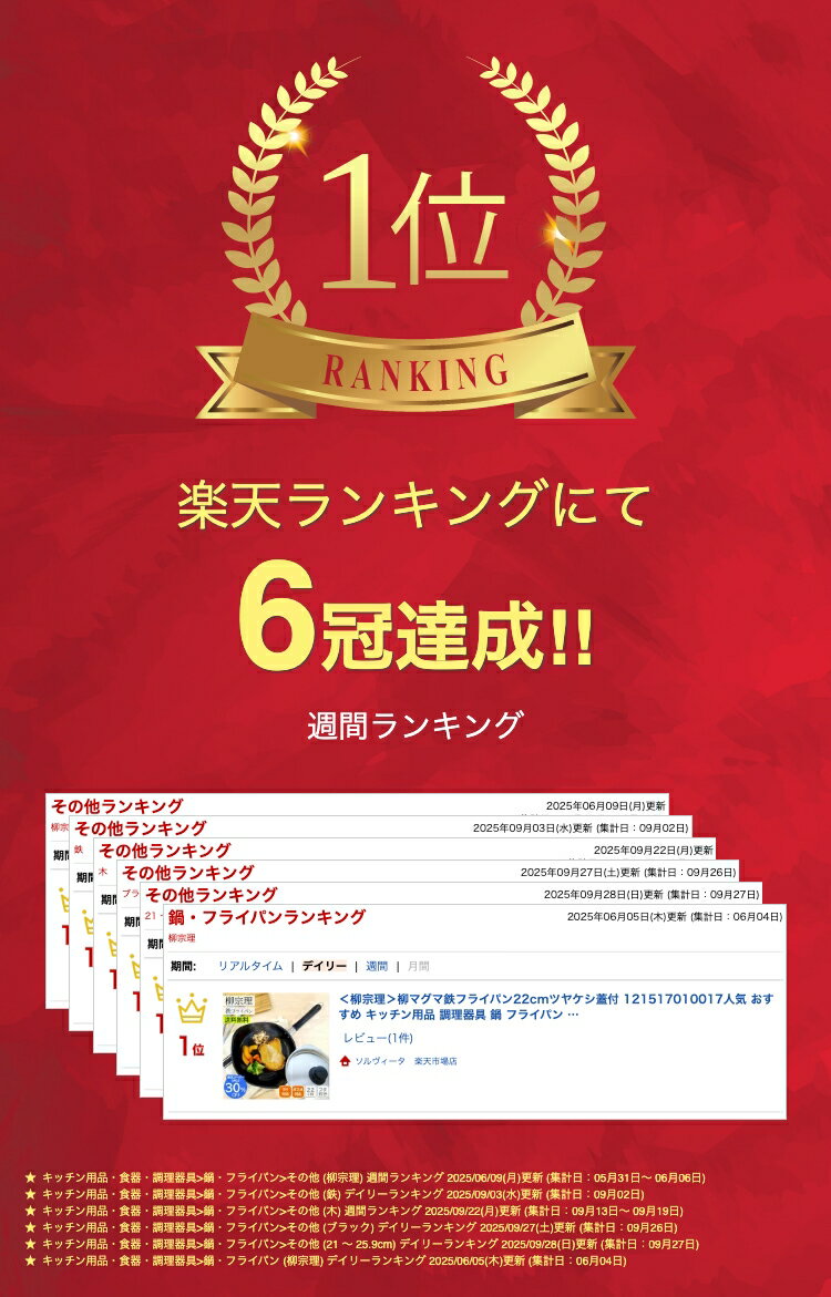 ブルーテンパ材の表裏両面に南部鉄器風の凹凸を浮き立たせ、表面保護のための黒色酸化皮膜、さらにその表面にはシリコン樹脂塗装を施した特殊加工。 食材とランダムな点で接触し、油なじみが良く、こげつきやこびりつきを抑える。 表面積が増えたことで、より多くの熱を受け、素早く食材を加熱。 鉄ならではの耐久性があり、強火調理や金属製ツールの使用などハードな使い方も可能。商品詳細ブランド柳宗理商品名柳マグマ鉄フライパン22cmツヤケシ蓋付現品・内容・サイズ・材質などサイズ:W400×260×H100mm・材質:鉄・ステンレス・フェノール樹脂・IH対応・[日本製]製造・生産・加工地日本製箱サイズ384x269x82総重量1,020g検索用キーワード人気 おすすめ キッチン用品 調理器具 鍋 フライパン こだわり 調理器具 プレゼント 新築 引越し 料理好き お祝い 柳宗理 おしゃれ ステンレス ボウル ザル フライパン 包丁 カトラリー レードル キッチンツール 品揃え SORI YANAGI関連商品<柳宗理>柳マグマ鉄フライパン25cmツヤケシ蓋付 121517010...<柳宗理>柳マグマ鉄フライパン18cmツヤケシ蓋付 121517010...ティファール インジニオ・ネオ IHルージュ アンリミテッド エッグロ...5,480円3,980円4,840円ティファール インジニオ・ネオ IHルージュ アンリミテッド フライパ...ティファール インジニオ・ネオ IHルージュ アンリミテッド ソースパ...<BWS SELECTION>卵1個で!鉄の卵焼き器卵焼き器 木製取っ...5,070円5,070円4,840円ティファール インジニオ・ネオ ロイヤルブルー インテンス ウォックパ...ティファール インジニオ・ネオ ロイヤルブルー インテンス フライパン...ティファール インジニオ・ネオ ロイヤルブルー インテンス ウォックパ...4,530円4,380円4,380円ティファール インジニオ・ネオ IHルージュ アンリミテッド ウォック...ティファール インジニオ・ネオ IHルージュ アンリミテッド ソースパ...ティファール インジニオ・ネオ IHルージュ アンリミテッド フライパ...5,760円5,690円5,690円の、前にクーポンをチェック★彡★彡とりあえずショップをお気に入り登録♪▽商品説明はココから▽SORI YANAGI柳宗理 柳マグマ鉄フライパン22cmツヤケシ蓋付ブルーテンパ材の表裏両面に南部鉄器風の凹凸を浮き立たせ、表面保護のための黒色酸化皮膜、さらにその表面にはシリコン樹脂塗装を施した特殊加工。食材とランダムな点で接触し、油なじみが良く、こげつきやこびりつきを抑える。表面積が増えたことで、より多くの熱を受け、素早く食材を加熱。鉄ならではの耐久性があり、強火調理や金属製ツールの使用などハードな使い方も可能。※モニター発色の具合により色合いが異なる場合がございます。