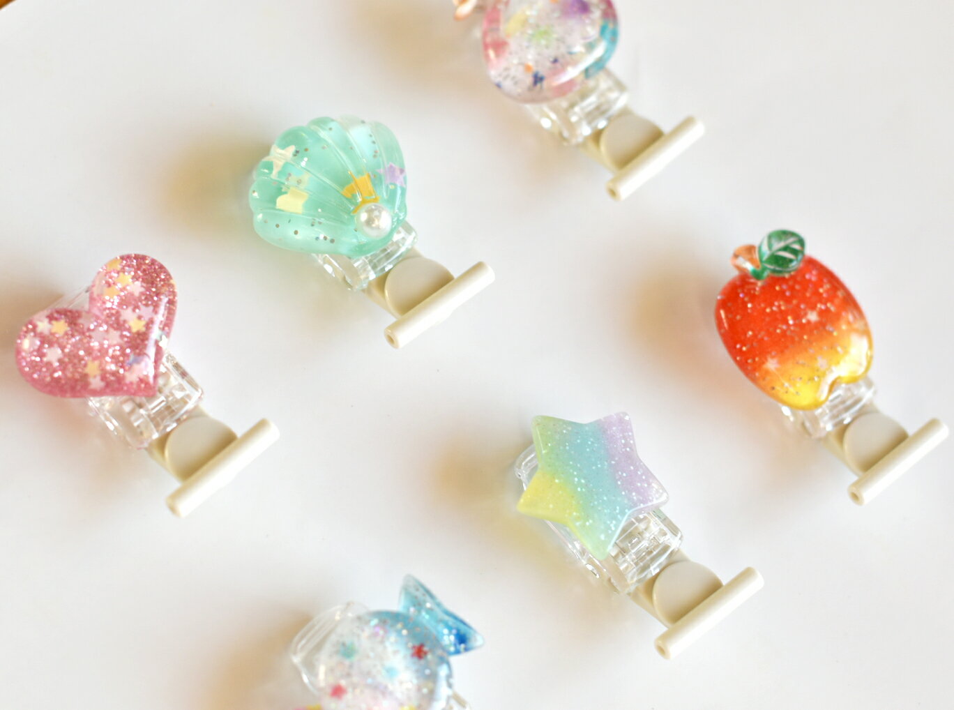 穴が開かない名札クリップ 名前 名札 穴の開かない クリップ 女の子 保育園 幼稚園 小学校 支援センター 子供 あかずぴん ピンフッククリップ ネームプレートハート スター 星 スワン りんご アップル キャンディー 貝殻 シェル くま うさぎ
