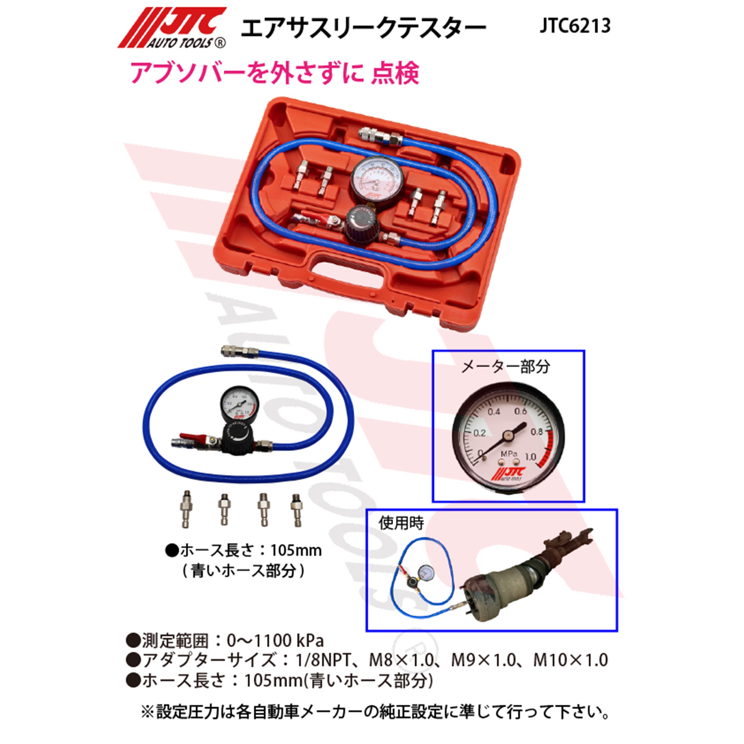 〇JTC6213 エアサスリークテスター アブソバーを外さずに 点検 ●エアサスペンションシステムにエアーを送り気密性テストに使用します ●設定圧力は各自動車メーカーの純正設定に準じて行って下さい ●測定範囲:0〜1100 kPa ●アダプターサイズ:1/8NPT、M8×1.0、M9×1.0、M10×1.0 詳細はメーカーHPをご確認下さい 【ご注意】 ■ 本商品は沖縄・離島への発送は行っておりません ■ 在庫欠品や納期が延びる場合はメールにてご連絡いたします ■ 商品画像はイメージです 実際の商品と色味や仕様が異なる場合がございます ■ パッケージや仕様はメーカーの都合により予告なく変更となる場合がございます ■ 配送業者はご指定いただけません