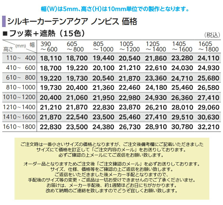 つっぱり式のノンビスタイプのアルミブラインドで賃貸などネジ穴が空けられない場所へつっぱりで設置できます。タチカワブラインドの横型ブラインドはカラーバリエーションも豊富で、25mm幅はRDS(減速降下機能)がついており、下に降ろすときにゆっくりスラットが降りる機能がついております。グロスレス遮熱のスラットは日射反射を高め室内温度の上昇を抑えることができます。フッ素遮熱は、遮熱機能プラススラットに汚れが付着しにくく、落としやすいスラットです。製品幅5mm、製品高さ1cm単位で製作できる日本製のアルミブラインドです。ノンビスタイプは、耐水仕様でキッチンや浴室への設置におすすめです。 カットサンプル依頼はこちらのお問合せフォームより送付先ご住所、品番をお知らせください ■商品名:ノンビス アルミブラインド シルキーカーテンアクア(耐水) スラット幅15mm※シルキーカーテンアクアはRDS(減速降下機能)はつきません。※取付はつっぱり式で設置(ノンビスタイプ) ■メーカー:タチカワブラインド ※メーカー保証3年メーカー希望小売価格はメーカーカタログに基づいて掲載しています▼ご注意イメージ写真はできる限り実物に近づけるよう、撮影を行っておりますが、モニターの種類や環境などにより、実物の明るさや色と微妙に異なる場合がございますので、ご了承の上ご注文ください。▼出荷日についてオーダーでの受注生産となりますためご注文後「ご注文確認のメール」を必ずお送りしております。サイズ、仕様、価格等をご確認の上ご返信をお願い致します。ご返信をいただきました後メーカー手配となりますので、手配後のサイズ等の変更・ご返品は一切お受けできませんのでご了承くださいませ。お届けは、メーカー手配後、約1週間ほどお日にちがかかります。改めて納期のご連絡を致しますのでどうぞ宜しくお願い致します。▼送料について沖縄、離島地域は別途中継料が別途かかりますので予めご了承の上ご注文お願い致します。ご注文いただきました後改めて送料のほう訂正しまして「ご注文内容のご確認」メールをお送り致しますのでどうぞ宜しくお願い致します。 ■ベーシックカラー(84色)T-5221 マットクリアホワイト・T-5521 マットスノーホワイト・T-5520 スノーホワイト・T-5523 マットマイルドオイスター・T-5224 マットカスタードイエロー・T-5083 マットホワイト・T-5050 マットピュアホワイト・T-5337 マットリネンホワイト・T-5353 マットナチュラルアイボリー・T-5123 マットバニラ・T-5137 マットアイスグレー・T-5349 マットソフトグレー・T-5119 オフホワイト・T-5223 マットライトグレージュ・T-5313 マットウールベージュ・T-5222 マットアッシュグレー・T-5524 マットアーバングレー・T-5125 マットホワイトフラックス・T-5567 マットカルアベージュ・T-5533 マットカプチーノ・T-5336 マットサンドグレー・T-5526 マットクラウドグレー・T-5014 ベージュ・T-5566 マットニュアンスブラウン・T-5354 マットソフトベージュ・T-5006 グレー・T-5527 マットブロンズブラック・T-5525 マットカーキグレー・T-5060 グレージュ・T-5536 マットカフェブラウン・T-5005 ブラック・T-5082 マットブラック・T-5535 マットブラウン・T-5537 マットアンバーブラウン・T-5355 マットチョコレートブラウン・T-5541 マットシュガーピンク・T-5565 アンティークアイボリー・T-5315 ポストアイボリー・T-5013 アイボリー・T-5513 マットアイボリー・T-5316 ベビーピンク・T-5564 サンディナチュラル・T-5538 マットシュガーイエロー・T-5357 フレッシュグリーン・T-5539 マットシュガーグリーン・T-5544 マットピュアピンク・T-5226 マットアプリコット・T-5543 マットモーニングイエロー・T-5117 マットホワイトリリー・T-5328 パウダーグリーン・T-5225 マットフォギーピンク・T-5227 マットマリーゴールド・T-5546 マットムーンイエロー・T-5019 ヤンググリーン・T-5510 マットスカイ・T-5347 マットクラウディピンク・T-5551 フレッシュオレンジ・T-5228 マットカナリアイエロー・T-5362 マットモスグリーン・T-5229 マットフロスティグリーン・T-5549 ファニーピンク・T-5555 マットマンダリンレッド・T-5322 クリアイエロー・T-5562 マットシェードグリーン・T-5351 マットスレートグレー・T-5061 マットワイン・T-5559 マットダークレッド・T-5531 マットハーベスト・T-5560 マットクラウディグリーン・T-5528 マットモダンブラック・T-5012 ホワイト・T-5542 マットスノーブルー・T-5540 マットシュガーブルー・T-5133 ライトサックス・T-5333 ベイビッシュブルー・T-5134 マットライトパープル・T-5230 マットアクアマリン・T-5360 パウダーブルー・T-5231 マットスレートブルー・T-5319 フロストブルー・T-5105 マットネービーブルー・T-5232 マットウルトラマリン・T-5563 マットミッドナイトブルー・T-5556 マットナイトパープル■ツートン(12色)T-5631 ・T-5641 ・T-5632 ・T-5642 ・T-5633 ・T-5643 ・T-5634 ・T-5644 ・T-5635 ・T-5645 ・T-5636 ・T-5646■遮熱・遮熱ツートン(40色)T-2522 シャインピュアホワイト・T-2576 