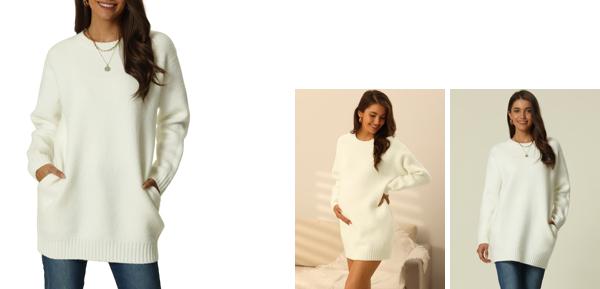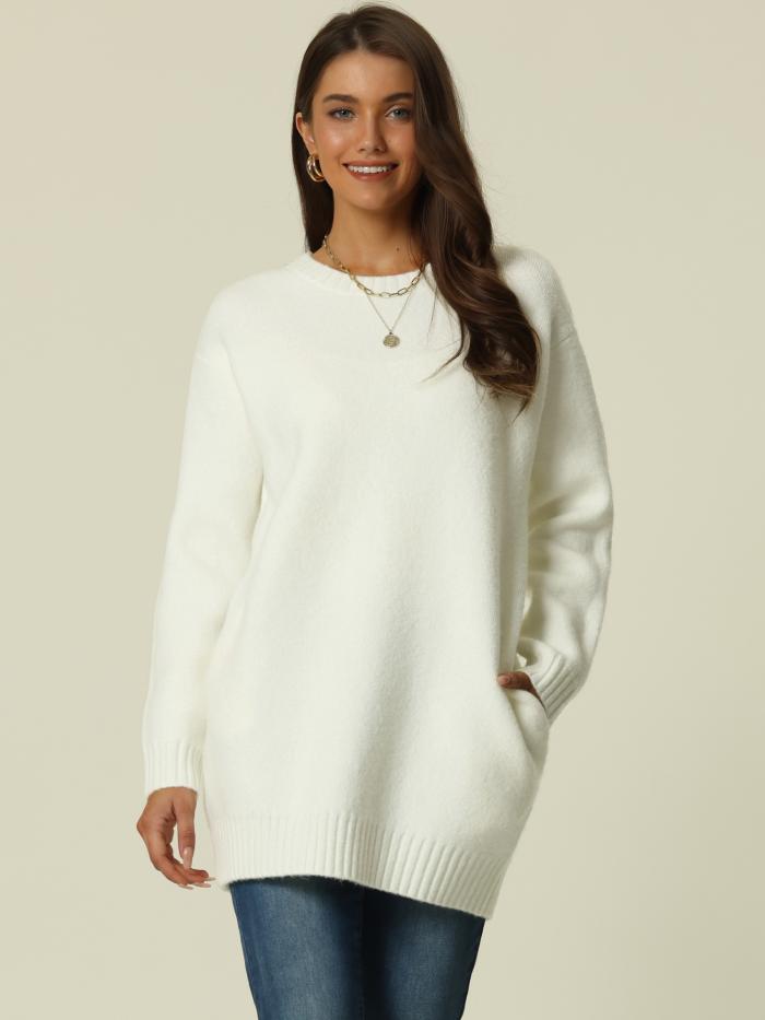 Seta T カジュアルトップス セーター チュニック 秋冬 ラウンドネック 長袖 ポケット付き レディース ホワイト L