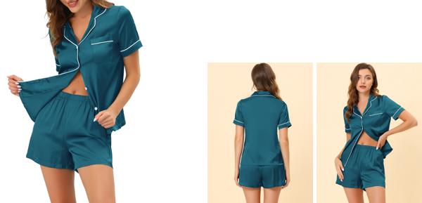 cheibear 女性用パジャマ ルームウェア 半袖 ボタンダウン サテン パジャマ セット ピーコックブルー M