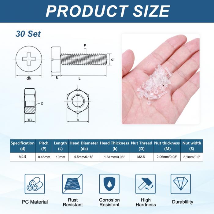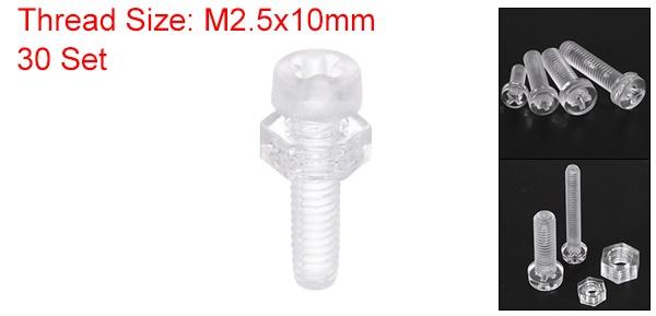 M2.5x10mm クリアアクリルネジと六角ナットキット 30セット PCプラスチックフィリっプスラウンドヘッドネジメートリック粗いスレッドボルト 機械アクセサリー用 透明