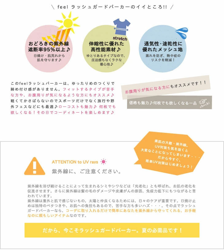 シーンから探す 海水浴 プール スクール 体育 小学校 中学校 高校 大学 水泳 スイミング シュノーケリング スノーケル サーフィン ダイビング ランニング キャンプ レジャー イベント アウトドア 海外旅行 特徴から探す 水着 長袖 パーカー ゆったり 大きいサイズ 小さいサイズ 体型カバー 水陸両用 おしゃれ 紫外線対策 日焼け予防 UVカット ドライ 速乾性 撥水 夏用 送料無料 XS S M L XL LL 2L 3L 4L 5L 性別から探す メンズ ジュニア 男性 子供 子ども こんなギフトシーンに 1月 お年賀 寒中見舞い 年始 お年玉 年始 挨拶 成人祝い 2月 バレンタイン 合格祈願 マラソン 3月 プチギフト 卒業式 合格祝い 卒業祝い 引っ越し祝い 退職 花見 4月 入学式 入学祝い 新生活 就職祝い 5月 ゴールデンウィーク 6月 プール開き 父の日 梅雨 ジューンブライド 7月 海の日 夏休み お中元 キャンプ 8月 暑中 残暑見舞い 盆休み 手土産 夏祭り 9月 敬老の日 お彼岸 10月 ハロウィン 発表会 運動会 体育祭 11月 七五三 文化祭 夫婦の日 12月 クリスマス 年末 年越し お歳暮 冬休み 福袋 帰省 誕生日 バースデー プレゼント ギフト グッズ 記念日 贈り物 結婚祝い 出産祝い お返し 内祝い 開店祝い 還暦祝い お祝い 昇進祝い 餞別 お見舞いSpec サイズ SS(総丈約60cm 身幅約44cm 肩幅約41cm 袖丈約59cm)、 S(総丈約63cm 身幅約47cm 肩幅約43cm 袖丈約61cm)、 M(総丈約66cm 身幅約50cm 肩幅約45cm 袖丈約62cm)、 L(総丈約69cm 身幅約53cm 肩幅約47cm 袖丈約63cm)、 LL(総丈約72cm 身幅約56cm 肩幅約49cm 袖丈約64cm)、 3L(総丈約75cm 身幅約60cm 肩幅約53cm 袖丈約65cm)、 4L(総丈約75cm 身幅約64cm 肩幅約54cm 袖丈約65cm)、 5L(総丈約75cm 身幅約68cm 肩幅約56cm 袖丈約65cm) 素材 ポリエステル100% カラー ホワイト・ダークグレー・ブラック・ネイビー・ホットピンク・レッド・ターコイズ・ロイヤルブルー・ライトピンク・ライトイエロー・オレンジ・ライトブルー・ライトグリーン・ミントグリーン ブランド feel(フィール) feelは、あらゆる人にスポーツを体感して頂くためのフィールドウェアー。高品質素材を使用して、コストパフォーマンスに優れた商品を展開しています。 商品説明 ・日焼け、肌荒れ、擦り傷防止に優れており肌の露出対策にも最適です。 ・ルーズタイプでピッタリフィットするタイプとは異なり、ゆったりと着ることができます。 ・ラッシュガードの密着感を好まない方や体のラインを出したくない方におすすめです。 ・アウトドアでの虫さされ防止、海でのクラゲよけにもお使いいただけます。 ・速乾、薄手なので小さくたたんで気軽に持ち運びOK! ・海、プール、海水浴、旅行の移動時や車内でも使える。 豊富なサイズ・カラーバリエーションからお気に入りの1着を探してみてください。