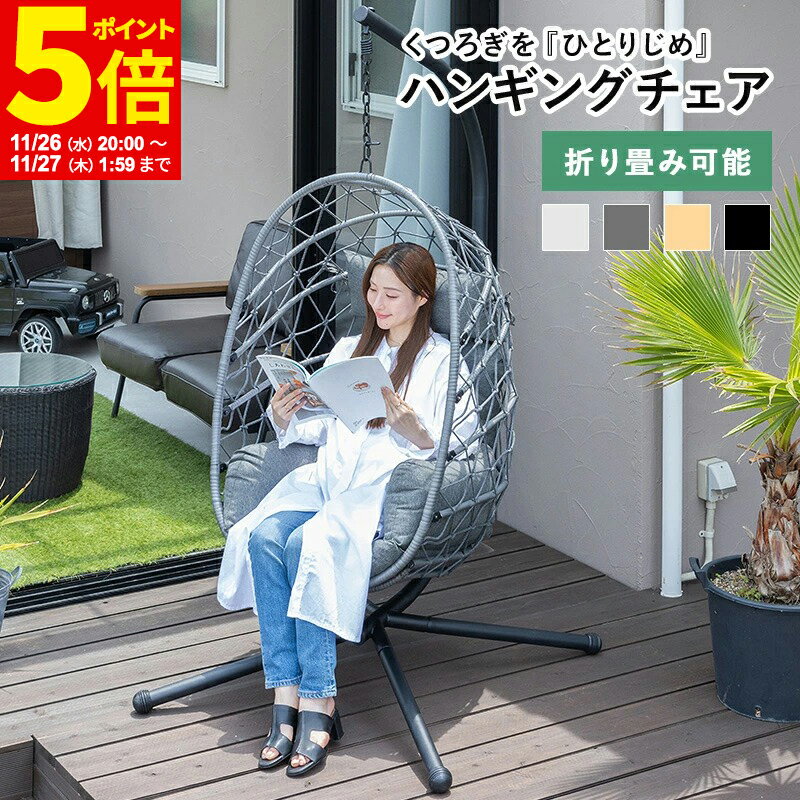 <在庫について> ご注文確定後の在庫確保となるためご注文のタイミングによって在庫切れとなる場合がございます。在庫切れの際は後程ご連絡させていただきます。 ブラックフライデーリラックスに最適、ハンギングチェア ゆらゆら揺れる折り畳み式ハンギングチェアです。 組立も簡単で折り畳み式なので好きな場所に設置でき、時間を忘れてのんびり浮遊感が楽しめます。 部屋に馴染むオリジナルカラー 安らぎと温もりを感じさせてくれるブラウン系のオリジナルカラーがお部屋をワンランク上のテイストにしてくれます。 塗装をしないこだわり チェーンとバネへの塗装は摩擦により剥がれやすいため、あえて無塗装にしています。 紫外線に強い耐候性樹脂を使用 本体にはグラデーションのかかった美しい人工ラタンを贅沢に使用。籐編みされた座面はしっかり丁寧に編み込まれています。高耐候性樹脂製の人工ラタンは日差しや水に強いため、屋外での使用が可能です。 体を包み込むふわふわクッション 撥水加工が施された厚さ約13cmのクッションは心地よく身体を包み込んでくれます。 ※完全防水ではありませんので水気は早めに拭き取ってください コンパクトに収納可能 本体は折りたため、支柱と土台は分解できるので、屋外への持ち出しや、屋内への搬入が楽に行えます。使用しない場合は、コンパクトに収納可能です。 女性一人でも簡単に持ち運べます 本体の高さ調節も簡単 チェーンの引掛ける位置を変えることによって本体の高さ調節が可能です。お子様が座る場合は本体が低くなるように調節してください。 クッションの取り外し可能 クッションの取り外し可能なので天日干しや収納の際には便利です。 クッションに付いている紐を本体に固定しておけば、離席・着席したときに落下を防いでくれます。 本体の巻き終わり箇所は画像のような留め方になっております。 コンパクトに持ち運べるので屋外に設置してくつろげます。 時間を忘れてのんびりとした時間が過ごせますね。 サイズ:支柱・土台/W約1125×H約1940×D約1060mm、本体/W約855×H約1180×D約680mm、座面/D約590mm 座面の高さ:SH約370mm~約610mm ※クッション含まず 座面の高さ(着席時):約85kg/SH約320mm、約65kg/SH約330mm、約45kg/SH約340mm ※クッション含まず 重量:支柱・土台/約17.6kg、本体/約7.5kg、クッション・枕/約2.6kg(多少の誤差があります) 耐荷重:120kg 梱包サイズ:W約1365×H約270×D約940mm 素材:本体/スチール・ポリエチレン(人口ラタン・ロープ)、支柱・土台/スチール、クッション/ポリエチレン 設置方法:組立品(専用工具付属) 出荷までの目安:1~3営業日(在庫があった場合) <ご注意> ※寸法サイズは目安です。誤差が生じることがございます。予めご了承ください。 ※椅子としての用途以外でのご使用はお控えください。 ※ブランコのように揺らして遊ばないでください。ケガの元になります。 ※お子様が座る際は保護者の方が付き添うようにしてください。 ※輸入品のため多少のキズ・汚れが付いています。 ※商品は全て配送先の玄関渡しとなります。 <在庫について> ※輸入品の為、在庫切れの場合には入荷までに数か月お時間がかかる場合がございますので、お急ぎの場合には、事前に在庫状況をお問い合わせください。 <送料について> ※お届け先により別途送料が必要な場合がございますのでご注文後に改めてご案内差し上げます。