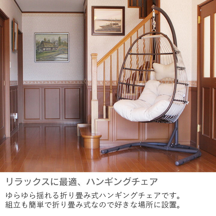 ハンギングチェア たまご型 屋外 パティオ コンパクト 「 ガーデン 折り畳み式 バスケット ヒーリング 」 クッション付き ヒーリングチェア リラックスチェア スモール リゾート 無塗装 ブランコ ブランコ椅子 揺れる 吊り下げ 椅子 イス スイング ハンギング チェア