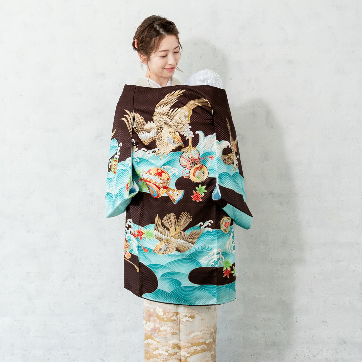 【12/1限定☆クーポンで10%OFF】【レンタル】 お宮参り 男の子 レンタル 産着 フルセット 茶色 ブラウン 宝尽くし 立波 和柄 男児 ポリエステル 掛け着 うぶぎ 祝着 記念撮影 赤ちゃん 祝い着 帽子 よだれかけ 創美苑 往復送料無料