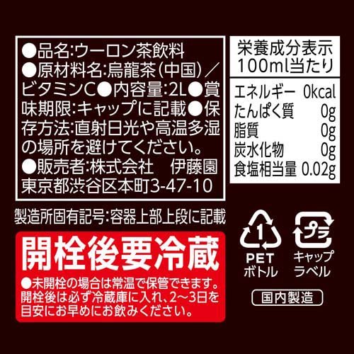 お店TOP>お茶>烏龍茶(ウーロン茶)>伊藤園 ウーロン茶 (6本入×2セット(1本2L))【伊藤園 ウーロン茶の商品詳細】●烏龍茶飲料ロングセラー商品●味わい深い「色種」・「水仙」を主体に使用。●1980年に誕生したロングセラー商品です。●烏龍茶・無糖茶のペットボトルをお探しの方におすすめです。【品名・名称】ウーロン茶飲料【伊藤園 ウーロン茶の原材料】烏龍茶(中国)/ビタミンC【栄養成分】100ml当たりエネルギー:0kcal、たんぱく質:0g、脂質:0g、炭水化物:0g、食塩相当量:0.02g【保存方法】直射日光や高温多湿の場所を避けてください。【注意事項】未開封の場合は常温で保管できます。開栓後は必ず冷蔵庫に入れ、2〜3日を目安にお早めにお飲みください。【原産国】日本【発売元、製造元、輸入元又は販売元】伊藤園※説明文は単品の内容です。リニューアルに伴い、パッケージ・内容等予告なく変更する場合がございます。予めご了承ください。・単品JAN:4901085630419伊藤園151-8550 東京都渋谷区本町3-47-100800-100-1100広告文責:楽天グループ株式会社電話:050-5306-1825[お茶]