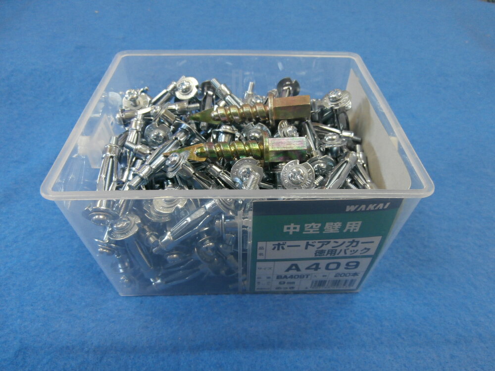徳用パック ボードアンカー(A409) 200本入x 6箱 中空構造の壁材に威力を発揮。 ボードアンカーを使用することで、ネジやクギが使えない中空構造の壁へ簡単に器具を取り付けることが可能です。例えば、照明器具・制御ボックス・ウォールキャビネット・ドアチェックの取付けなどに使用すると、作業がスムーズに進行します。 ※天井には使用しないで下さい。 サイズ 下穴径:9mm 適合板厚:3〜9.5mm 入数:200本 x 6箱 メーカー:若井産業株式会社(WAKAI)