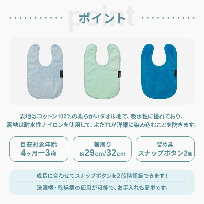 マムトゥーマム【Mum2Mum スタイ】日本正規品 スタンダード ワンダービブ/よだれかけ/スタイ☆ ラッピング不可 数々の賞を受賞した世界のママが認めた高品質ブランド!一度使ったら手放せない!リピーター続出です。 ブランド マムトゥーマム【Mum2Mum】 アイテム ビブ/よだれかけ (mum2mum スタイ) 色 各色 サイズ サイズ:首周り:約29cm/32cm 留め具:スナップボタン2個 (成長に合わせてスナップボタンを2段階調節できます) 素材表記 表地:コットン100% 裏地:ナイロン100% 縁取り:コットン80%、ポリエステル20% 備考 できるだけ忠実に再現するよう努力しておりますが、ディスプレイ画面等の環境上、ページで見た色と実際の商品の色とは多少違う場合がございます。ご不明な点はお問い合わせください。 おすすめ ポイント ビブシリーズの原型となった最もベーシックなデザイン。広範囲をカバーできます!