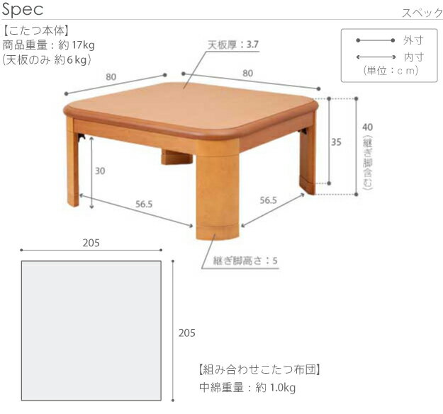 ※メーカー直送のため代金引換はお受けできません。 ※沖縄・一部離島は別途送料がかかります。お見積もりいたしますのでお問い合わせ下さい。 【セット構成】 こたつ本体x1 掛布団x1 【カラーバリエーション】 ■こたつ本体 ブラウン・ナチュラル ■掛布団 モリノキ・アツマリ・シラカバ・ケイランサス・サンフラワー・ダイリン 【仕様】 ■こたつ本体 天板:天然木化粧繊維板(楢柾目) 脚部:天然木(ラバーウッド) 手元コントローラー式 ◎一部組立(脚部) ■掛布団 表地:ポリエステル100% 裏地:綿100% 中綿:ポリエステル100%(中空綿) ウォッシャブル 【サイズ】 ■こたつ本体 幅80x奥行80x高さ約40cm 重量:約17kg 本体高さ:約35/40cm 天板サイズ:幅80x奥行80cm・厚み37mm・約6kg 脚間:56.5/56.5cm 幕板下高さ:30cm ■掛布団 幅205x奥行205cm 重量:約3kg 中綿:約1.0kg 株式会社ナカムラ(N11100243)こたつ単品 >80x80   >105x75   >120x80 >150x80   >180x100   >210x100 こたつ+国産北欧柄こたつ布団セット >80x80   >105x75   >120x80 >150x80   >180x100   >210x100