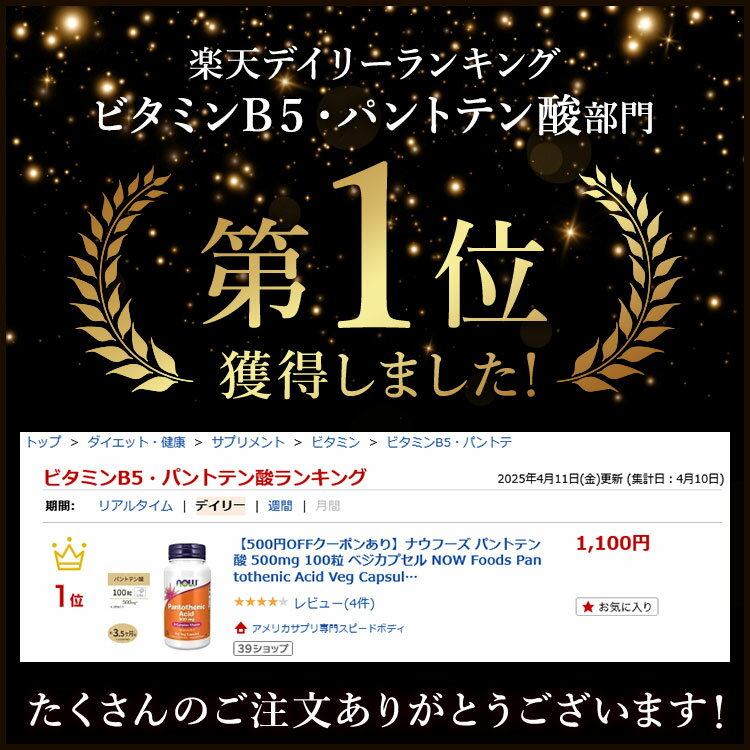 【最大1400円OFFクーポン】ナウフーズ パントテン酸 500mg 100粒 ベジカプセル NOW Foods Pantothenic Acid Veg Capsules ビタミンB5 水溶性ビタミン エネルギー 美容サポート ダイエットサポート